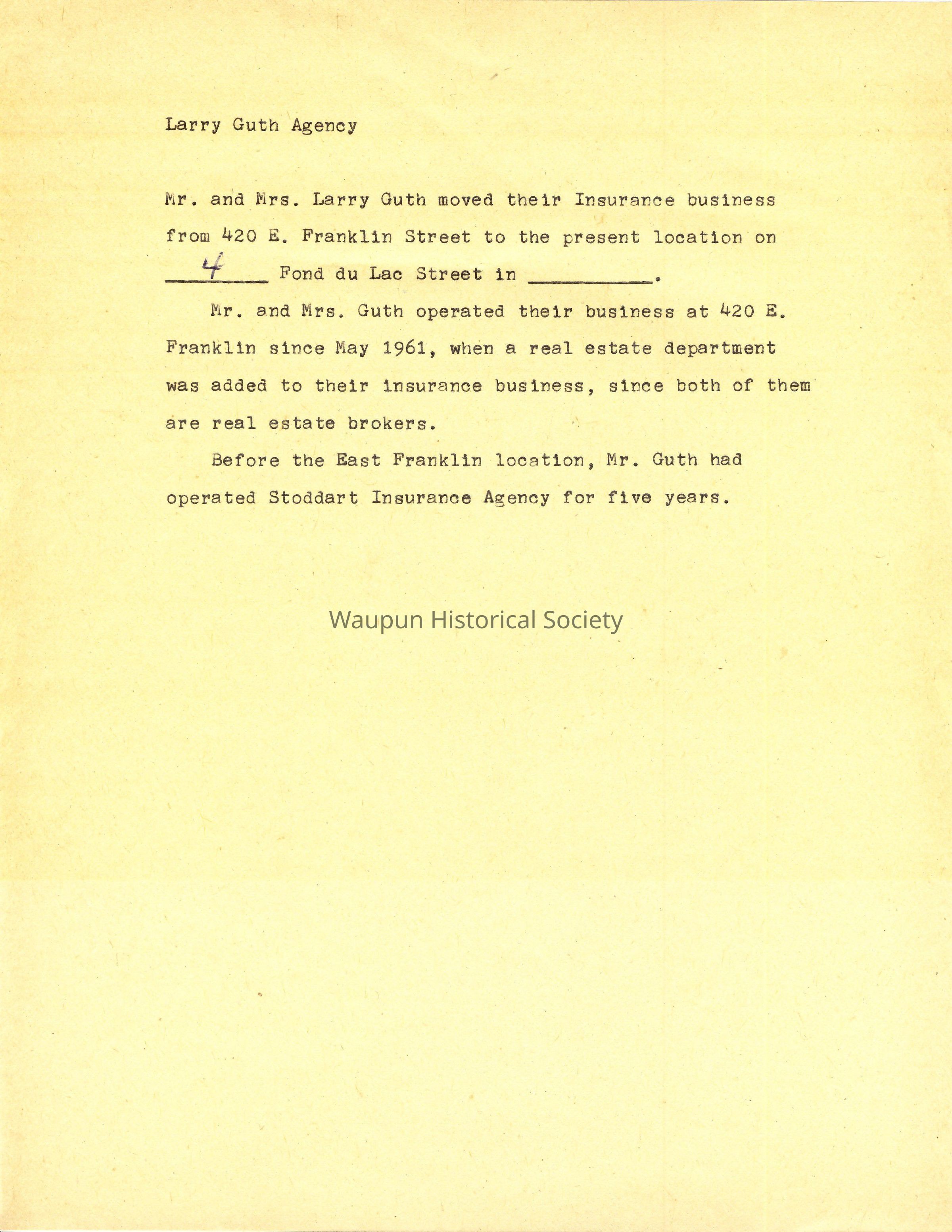 Mr. and Mrs. Larry Guth moved their Insurance business from 420 E. Franklin Street to the present location on 4 Fond du Lac Street in . . . . . . .