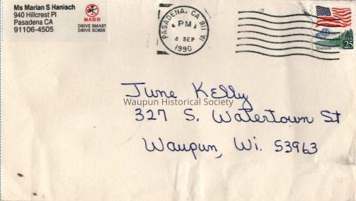 Letter and Envelope from Marian Hanisch to June Kelly