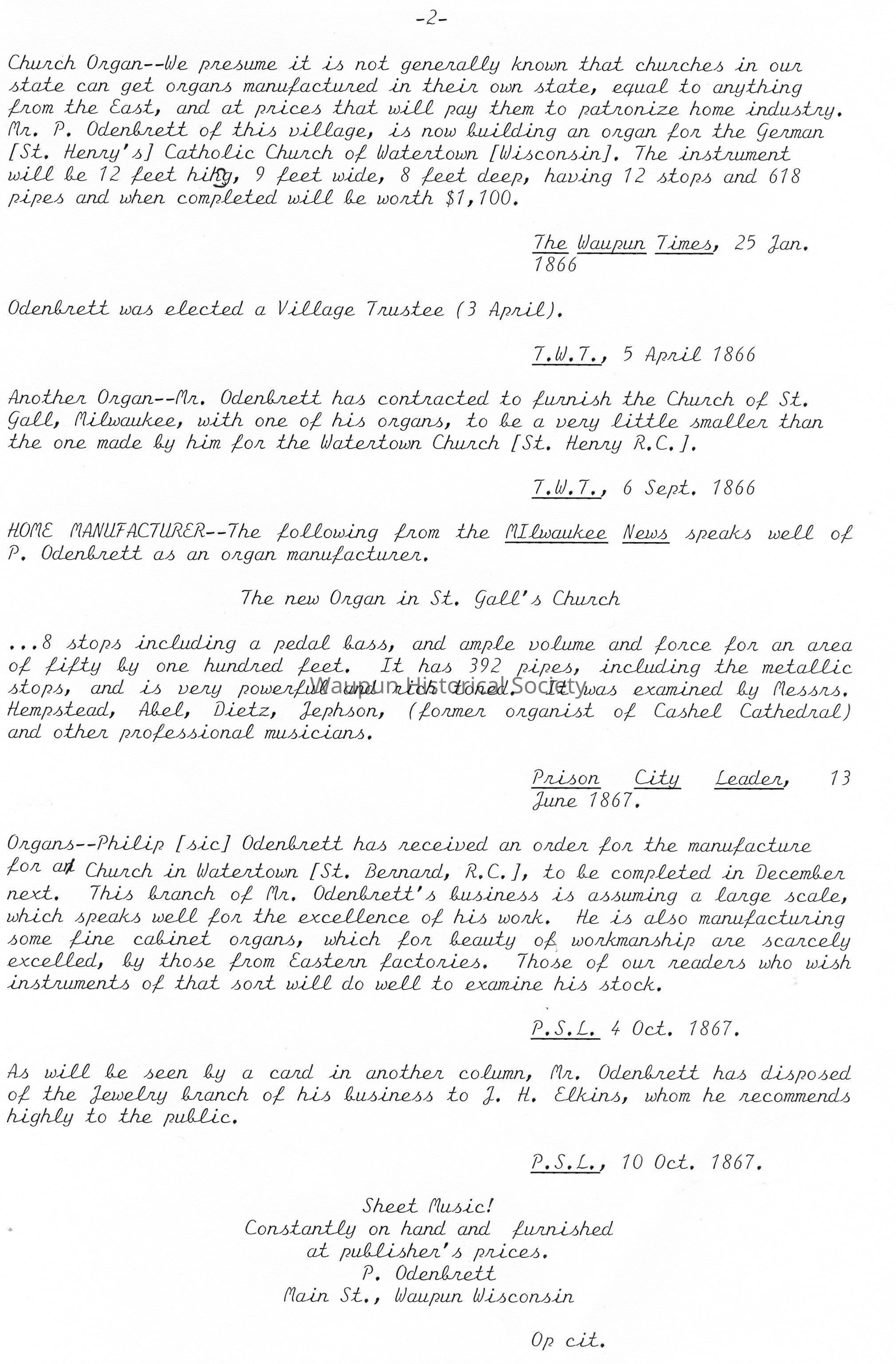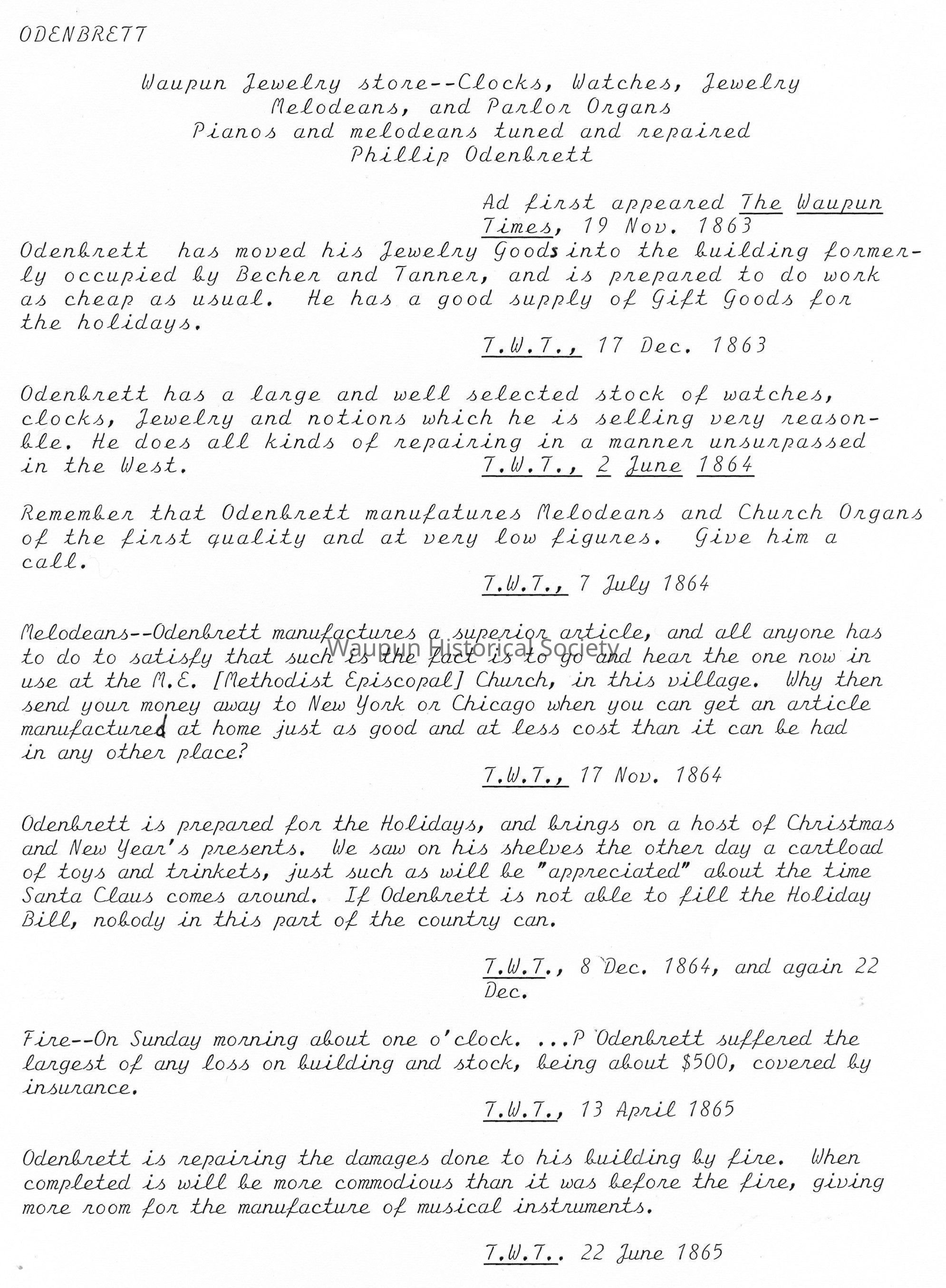 Please find enclosed copies of Waupun newspapers with pertinant data about Phillip Odenbrett. The first evidence of his being in Waupun is in 1863. I rather doubt if there were City Directories for that early period, so there is no way of yet establishing when he arrived there. He did belong to the Catholic Church there, and you will note that in my article his wife, Sophia, was sponsor for a baptism at St. Joseph. ( Page 29 Note 74)
