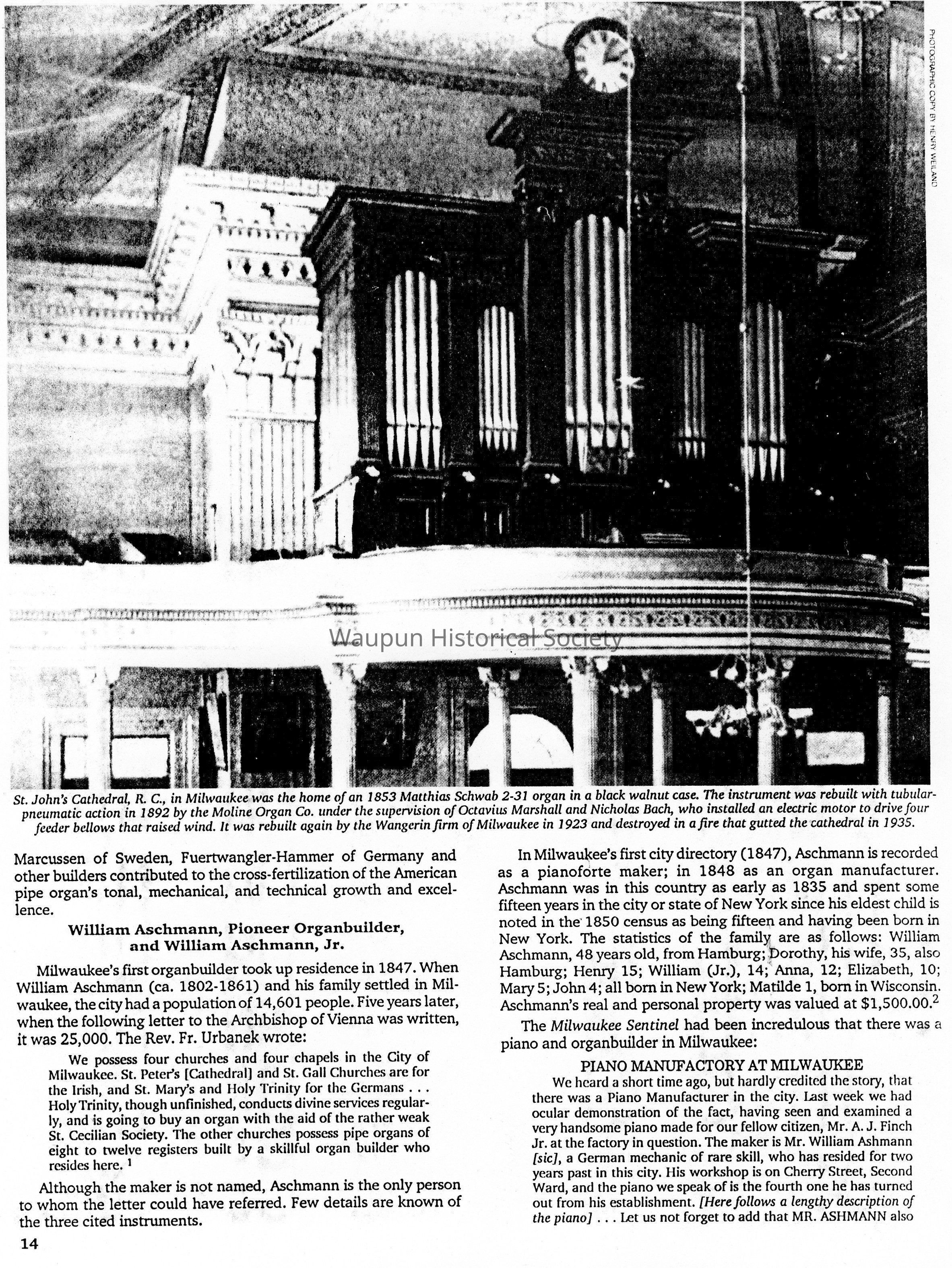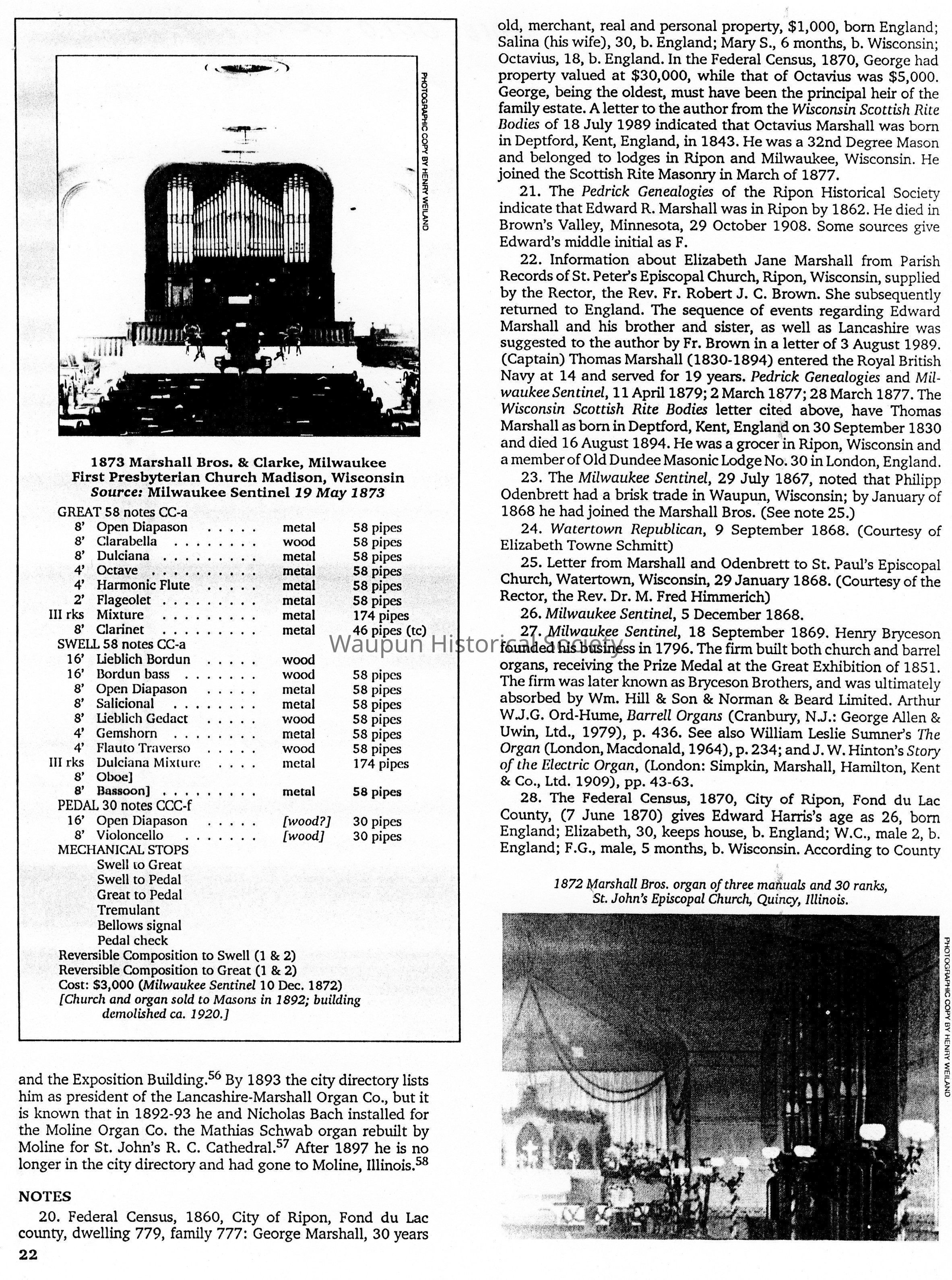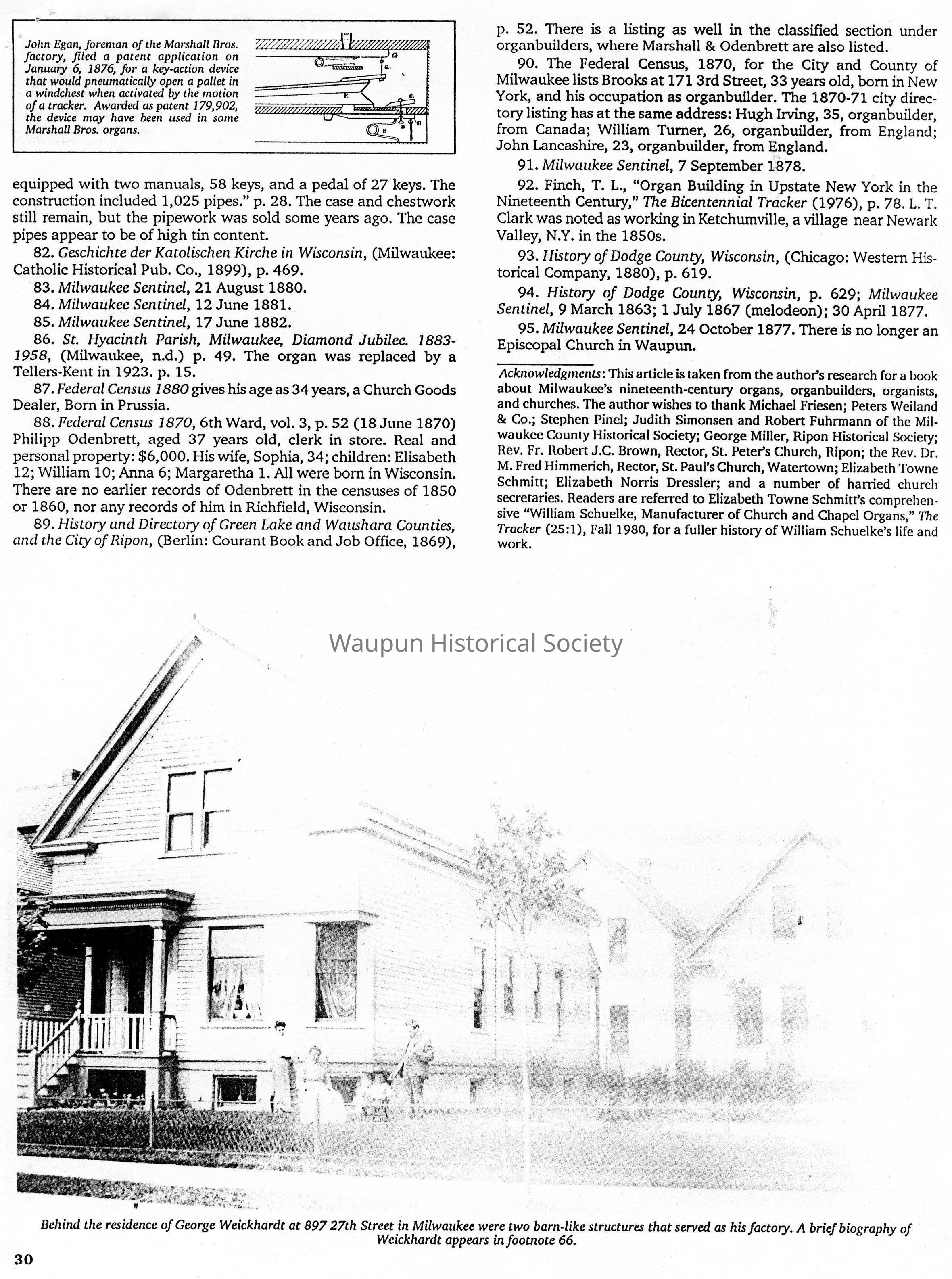 His shop was apparently on Main street from the info in the Waupun papers. It would be of great interest to me if the photography shop might have pictures of it, or perhaps even a photo of a new organ is his manufactory. So you might look or have them do so to see if there are any photos of organs, even in churches. I would appreciate anything that you can find out from the photography store. If need be, I will come up to Waupun to see what they have.