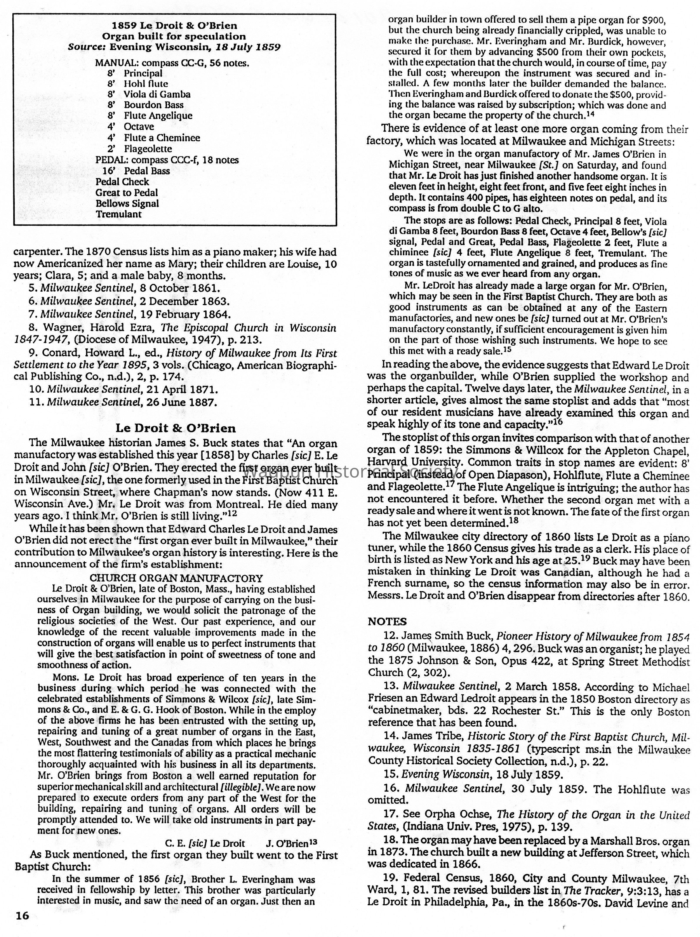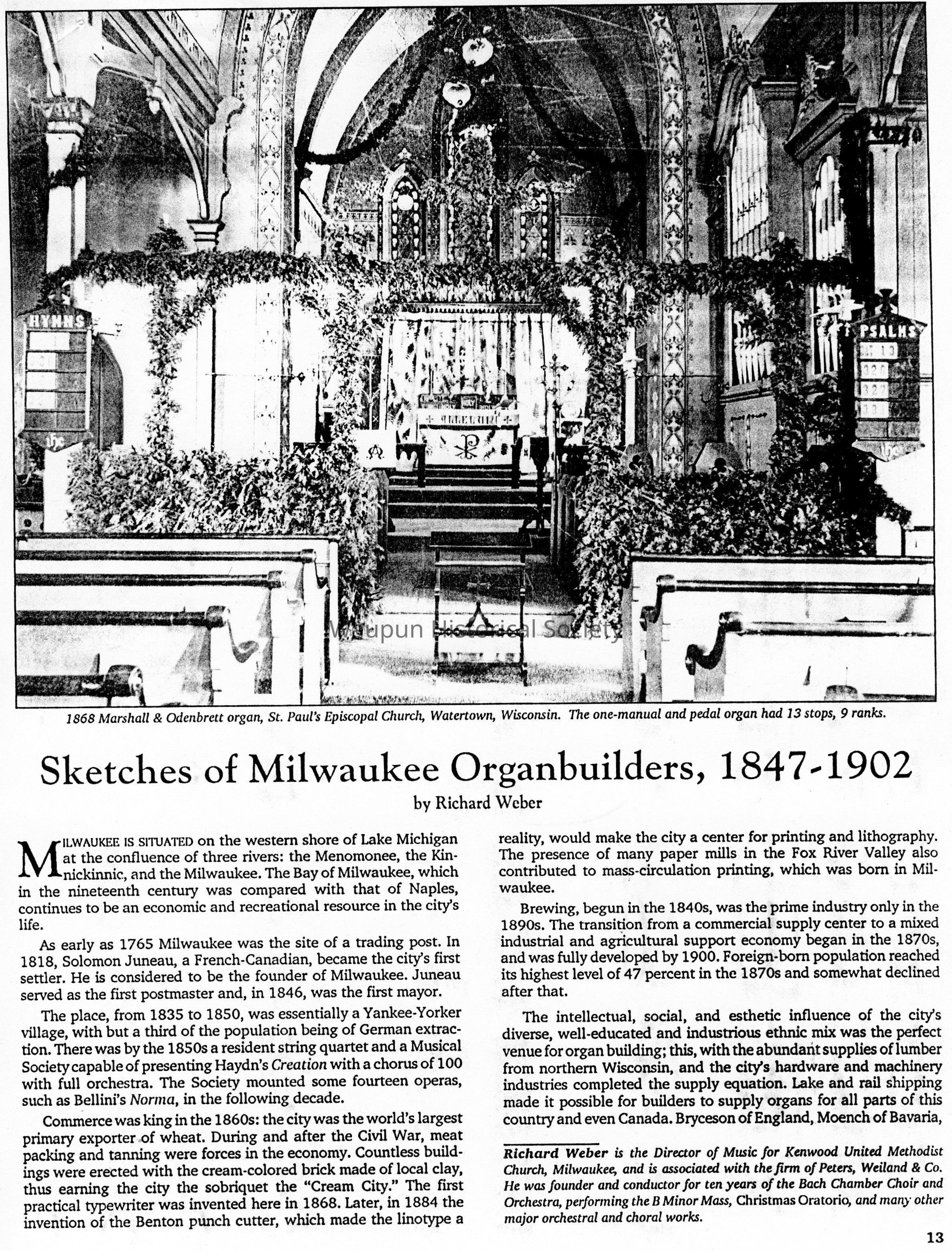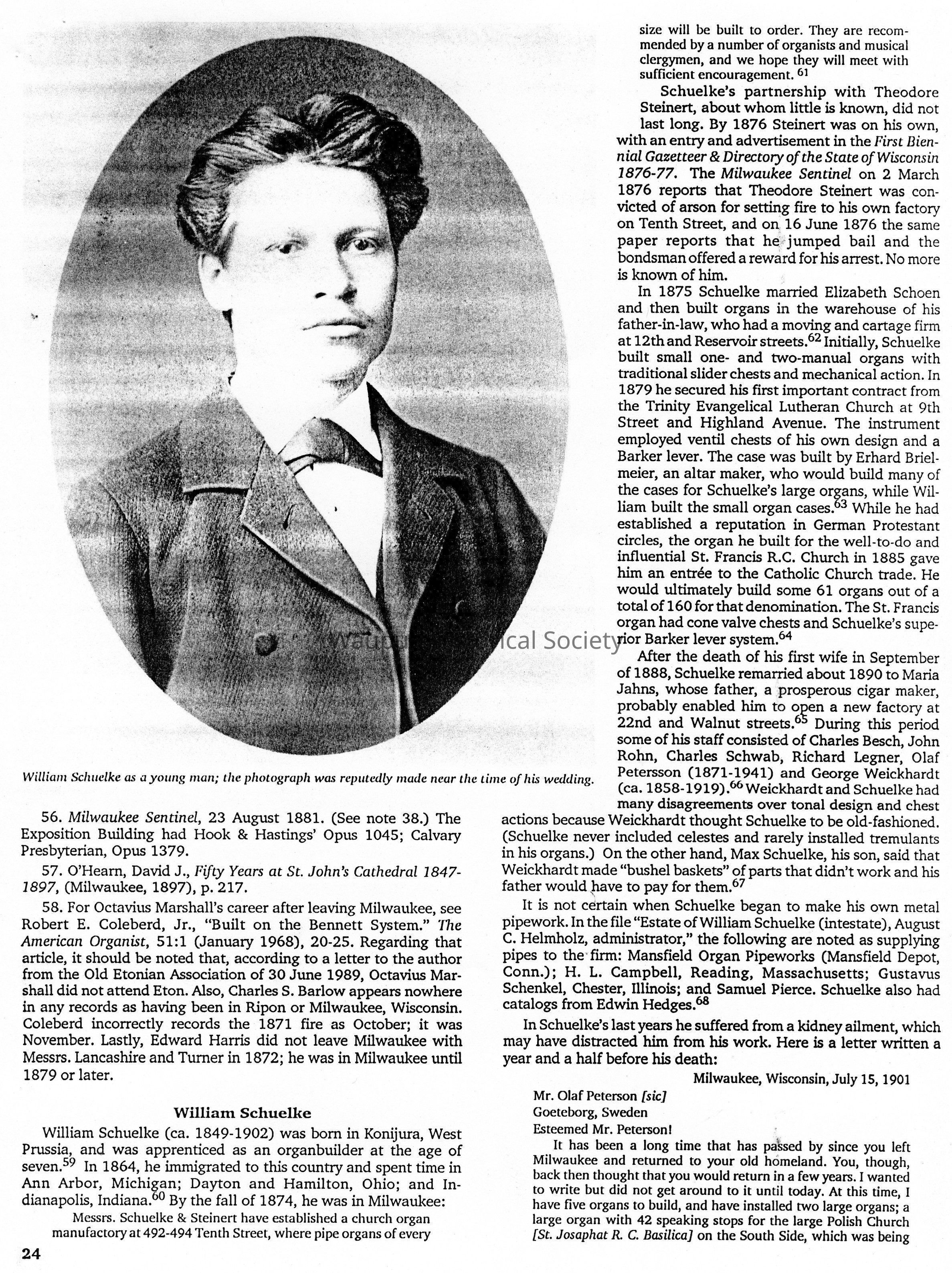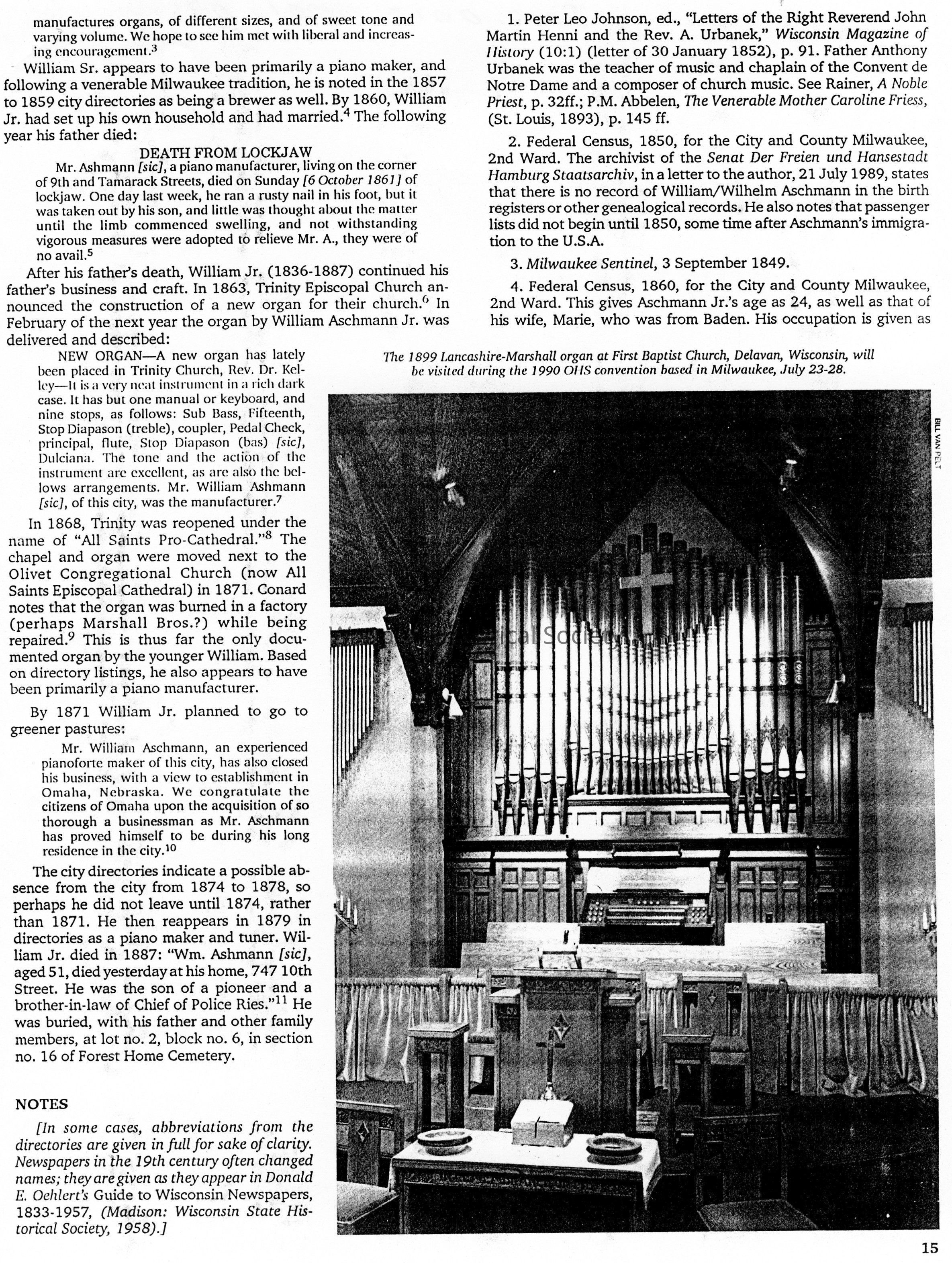 His shop was apparently on Main street from the info in the Waupun papers. It would be of great interest to me if the photography shop might have pictures of it, or perhaps even a photo of a new organ is his manufactory. So you might look or have them do so to see if there are any photos of organs, even in churches. I would appreciate anything that you can find out from the photography store. If need be, I will come up to Waupun to see what they have.