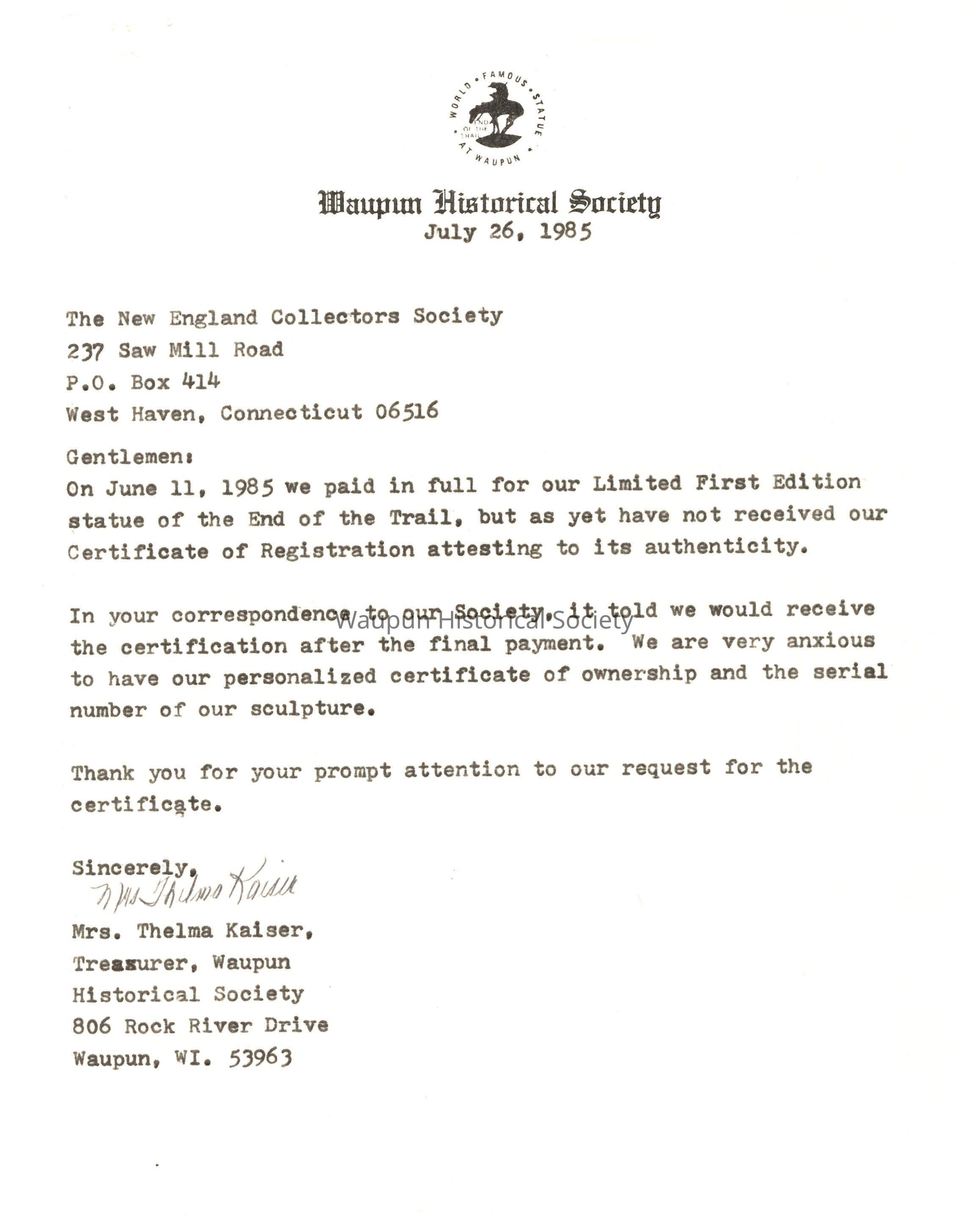 Letter to The New England Collectors Society regarding Certificate of Registration for the Limited First Edition statue of the End of the Trail, dated July 26, 1985. Also, a receipt of payment in full of $148.50, dated June 11, 1985 for invoice dated June 7, 1985.