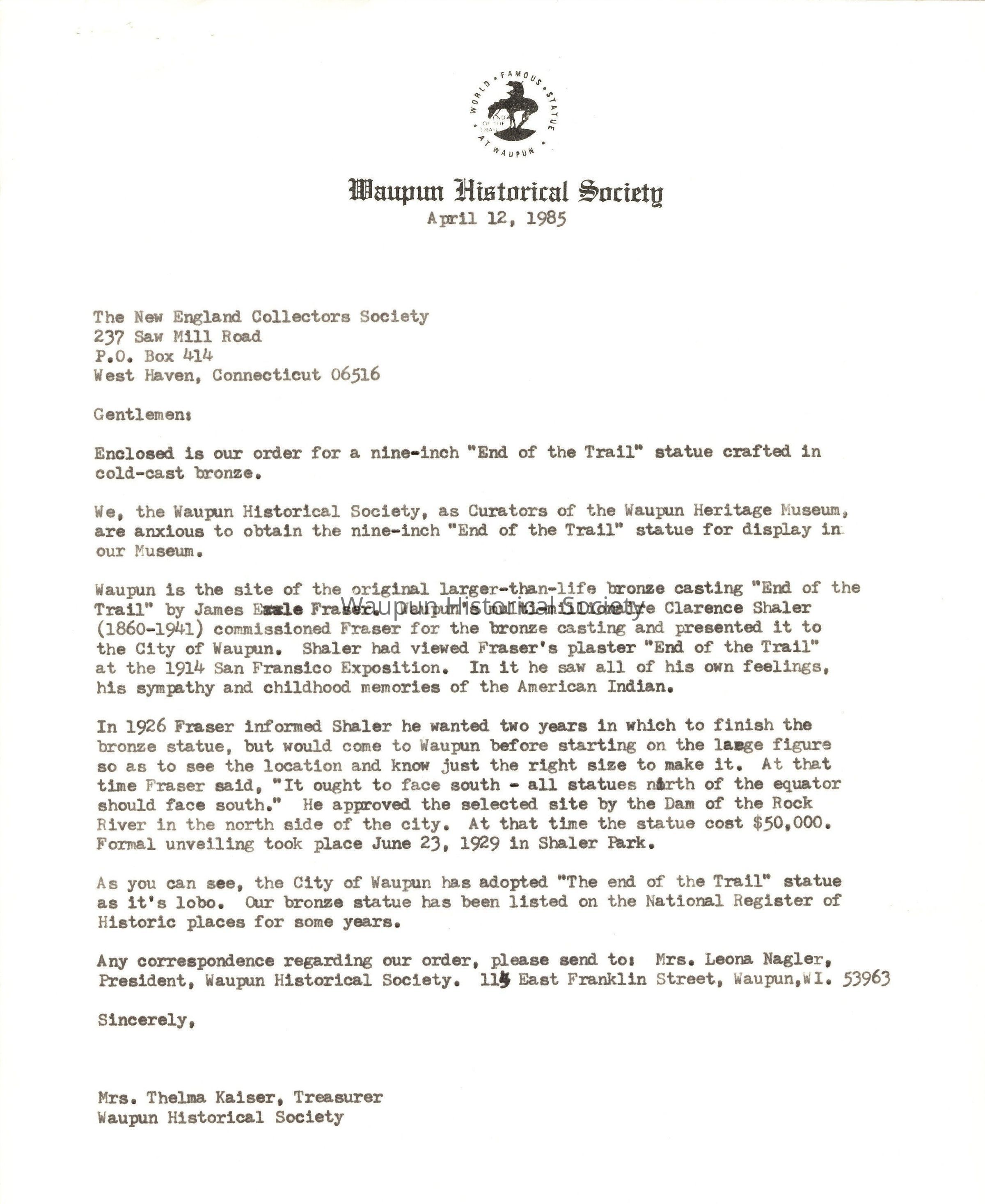 Letter pertaining to order of 9" "End of the Trail" statue, dated April 12, 1985.