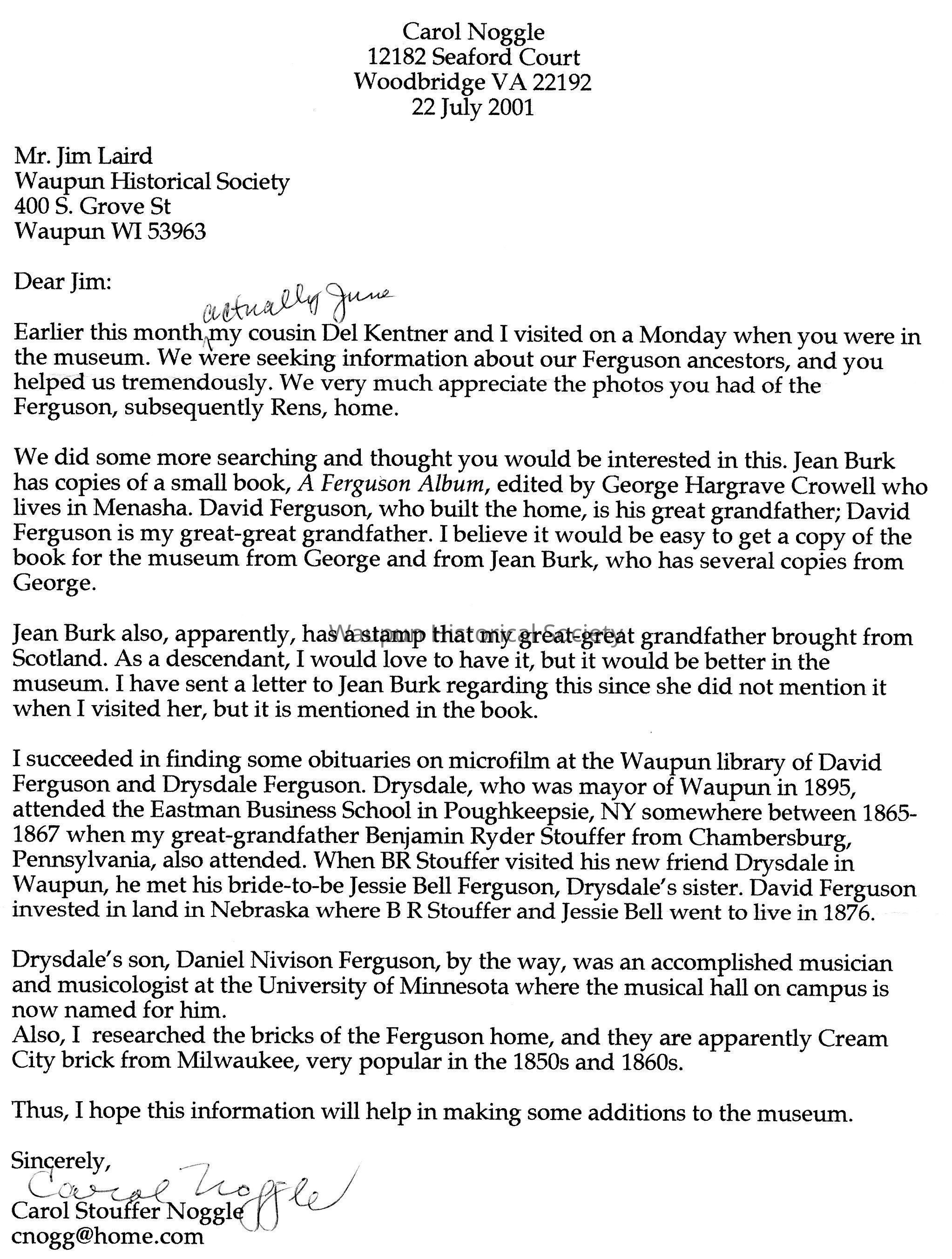 I succeeded in finding some obituaries on microfilm at the Waupun library of David Ferguson and Drysdale Ferguson. Drysdale, who was mayor of Waupun in 1895, attended the Eastman Business School in Poughkeepsie, NY somewhere between 18651867 when my great-grandfather Benjamin Ryder Stouffer from Chambersburg, Pennsylvania, also attended. When BR Stouffer visited his new friend Drysdale in Waupun, he met his bride-to-be Jessie Bell Ferguson, Drysdale's sister. David Ferguson invested in land in Nebraska where B R Stouffer and Jessie Bell went to live in 1876.