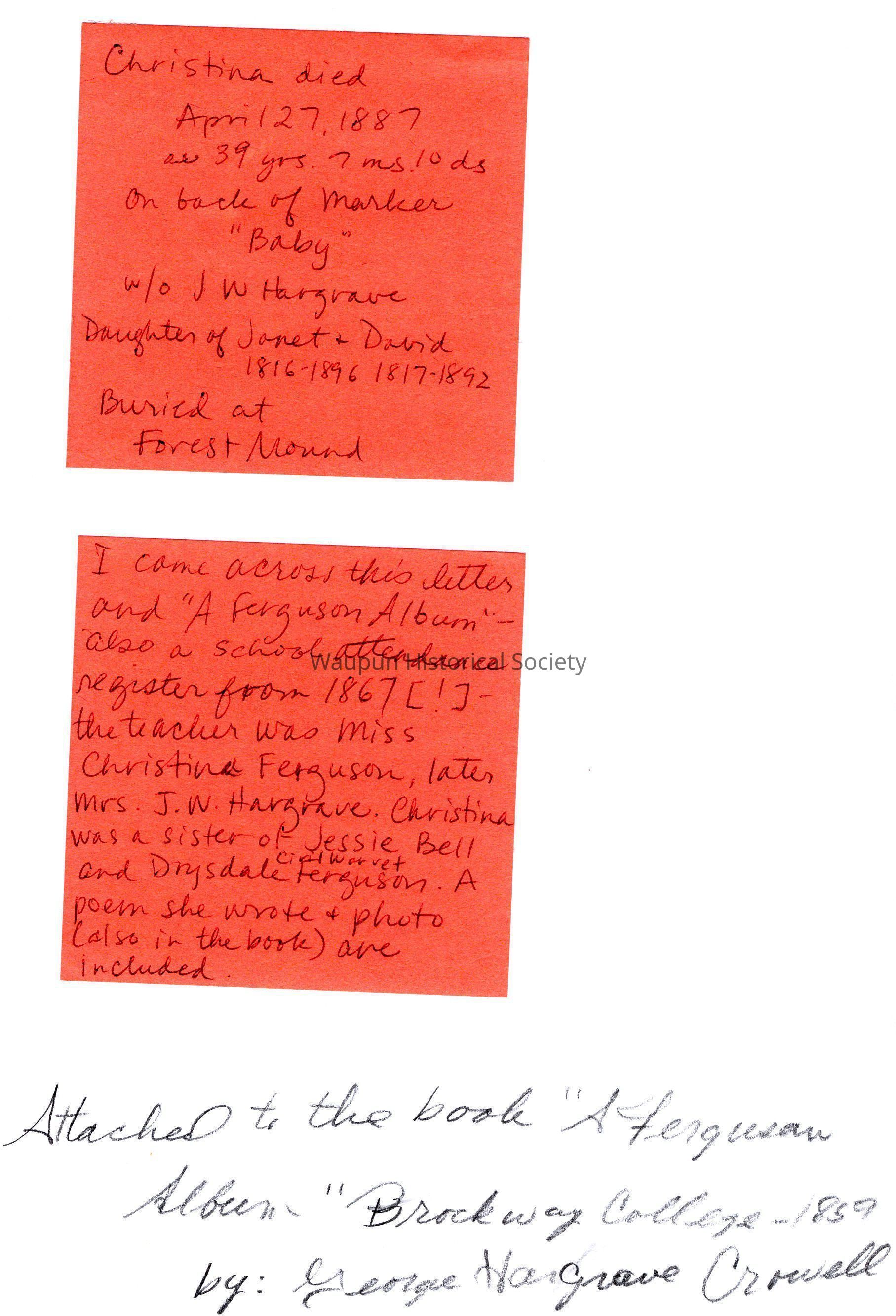 We did some more searching and thought you would be interested in this. Jean Burk has copies of a small book, A Ferguson Album, edited by George Hargrave Crowell who lives in Menasha. David Ferguson, who built the home, is his great grandfather; David Ferguson is my great-great grandfather. I believe it would be easy to get a copy of the book for the museum from George and from Jean Burk, who has several copies from George.