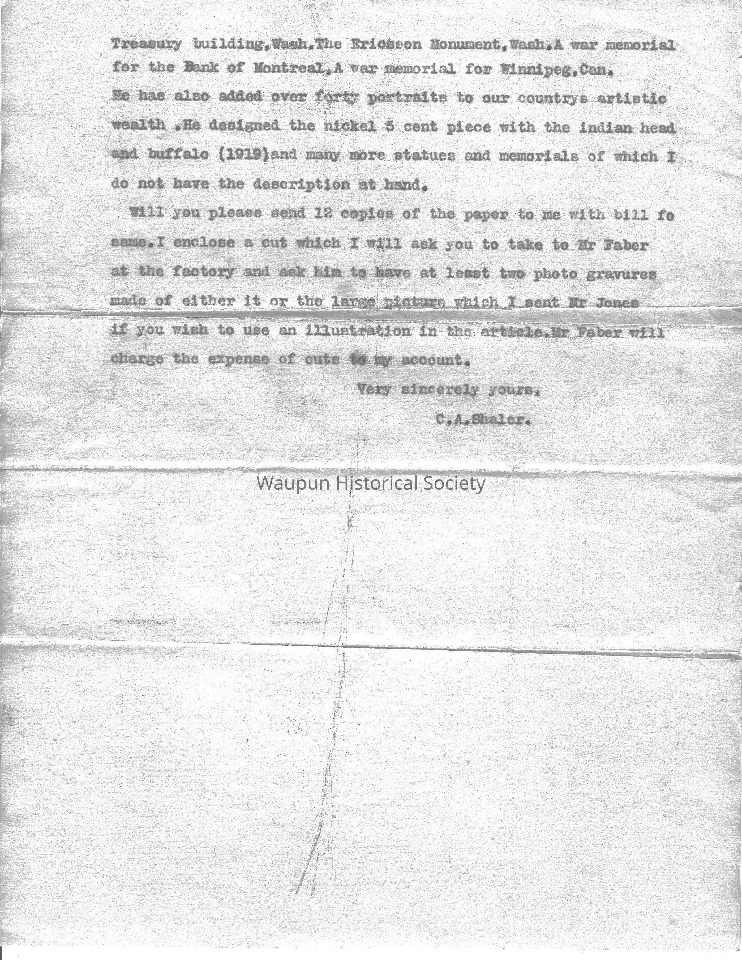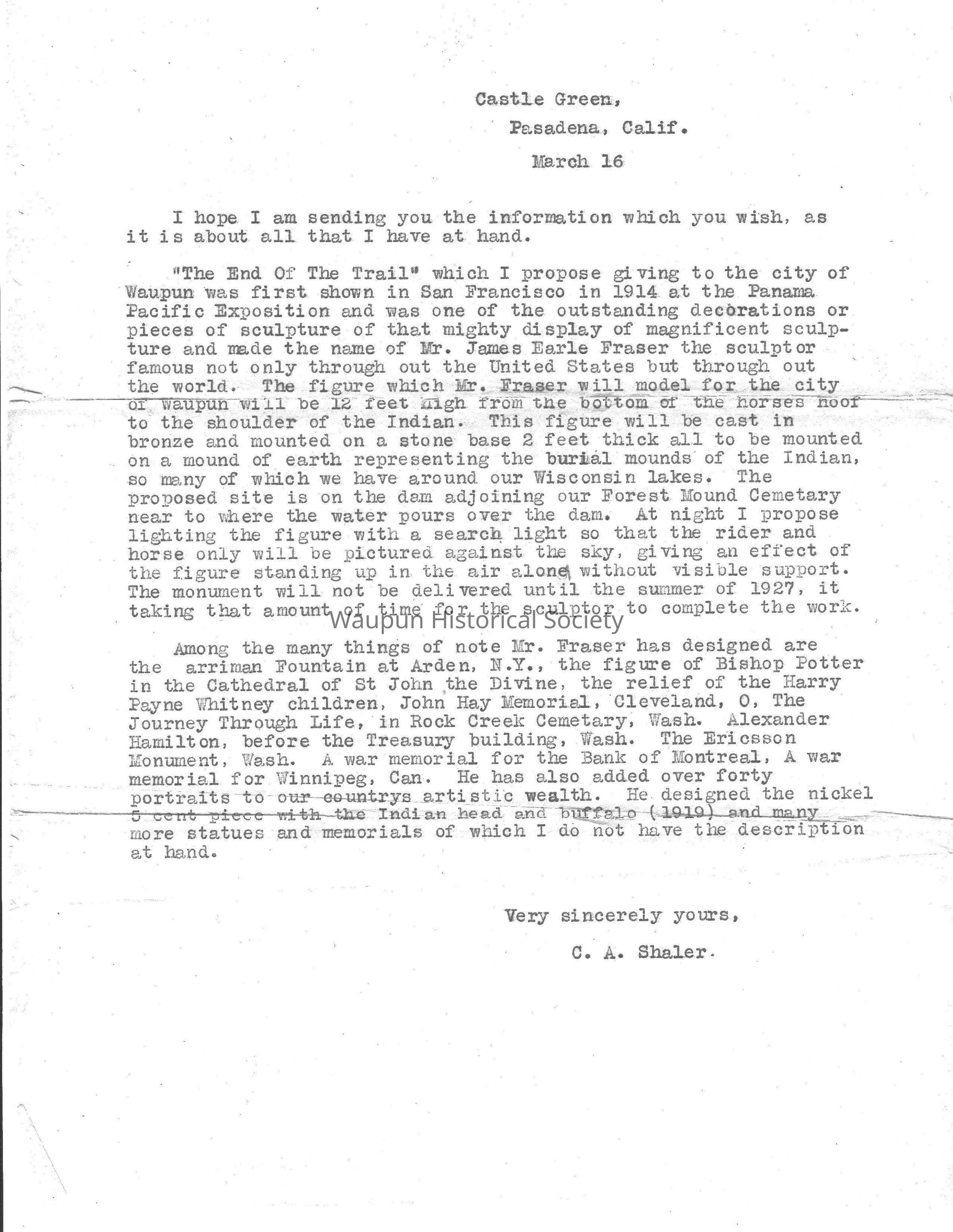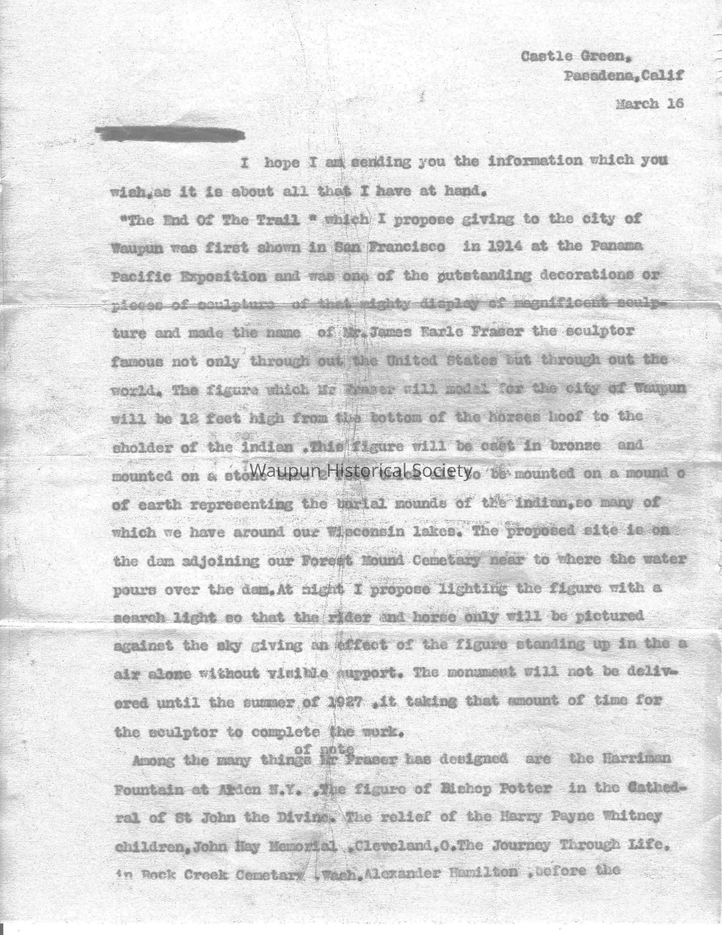 "The End Of The Trail" which I propose giving to the city of Waupun was first shown in San Francisco in 1914 (note: The Panama Pacific Exposition was in 1915) at the Panama Pacific Exposition and was one of the outstanding decorations or pieces of sculpture of that mighty display of magnificent sculpture and made the name of Mr. James Earle Fraser the sculptor famous not only through out the United States but through out the world. The figure which Mr. Fraser will model for the city of waupun will be 12 feet high from the bottom of the horses hoof to the shoulder of the Indian. This figure will be cast in bronze and mounted on a stone base 2 feet thick all to be mounted on a mound of earth representing the burial mounds of the Indian, so many of which we have around our Wisconsin lakes. The proposed site is on the dam adjoining our Forest Mound Cemetary (sp) near to where the water pours over the dam. At night I propose lighting the figure with a search light so that the rider and horse only will be pictured against the sky, giving an effect of the figure standing up in the air along; without visible support. The monument will not be delivered until the summer of 1927, (note: the statue was delivered in 1929) it taking that amount of time for the sculptor to complete the work.