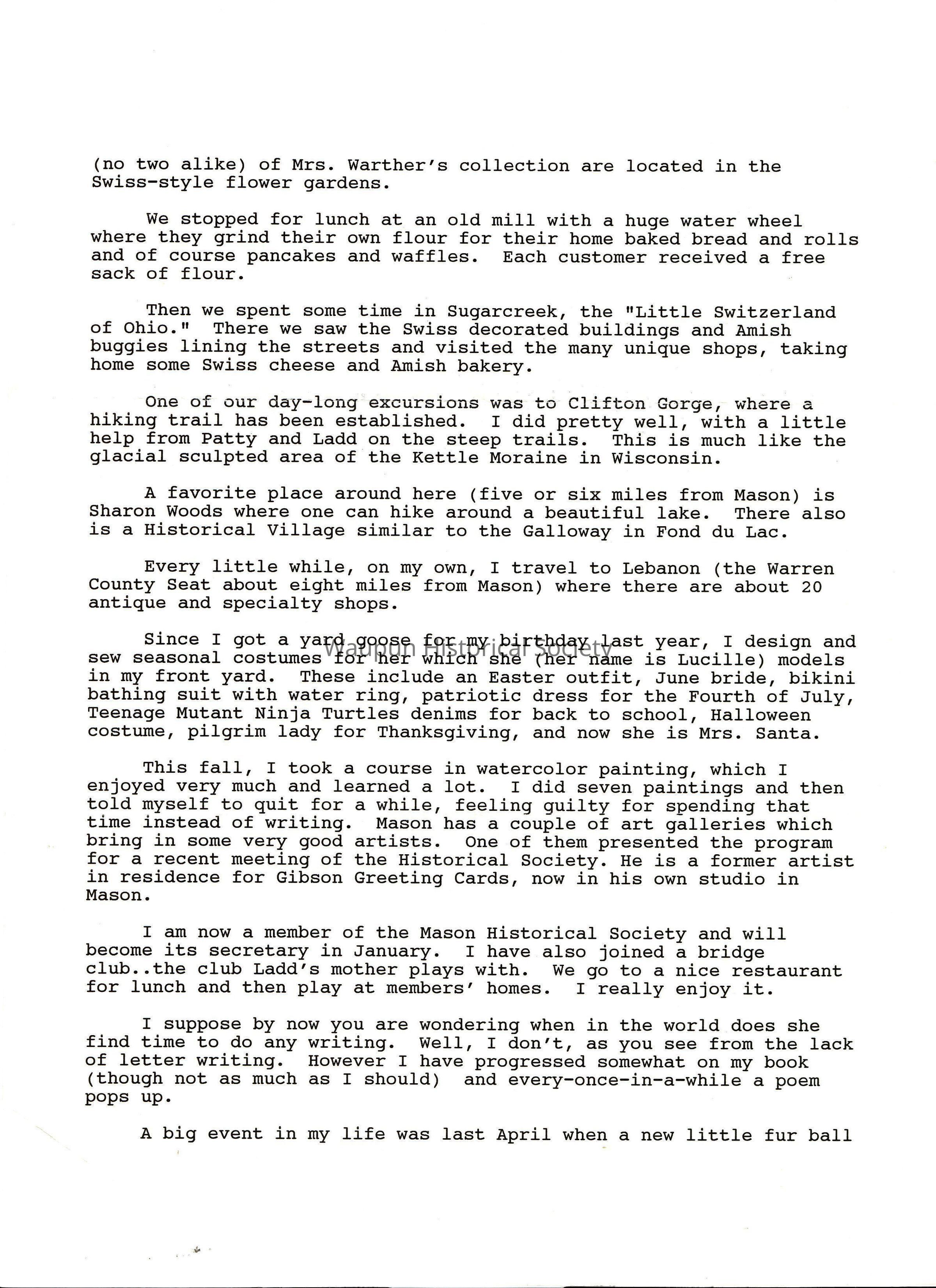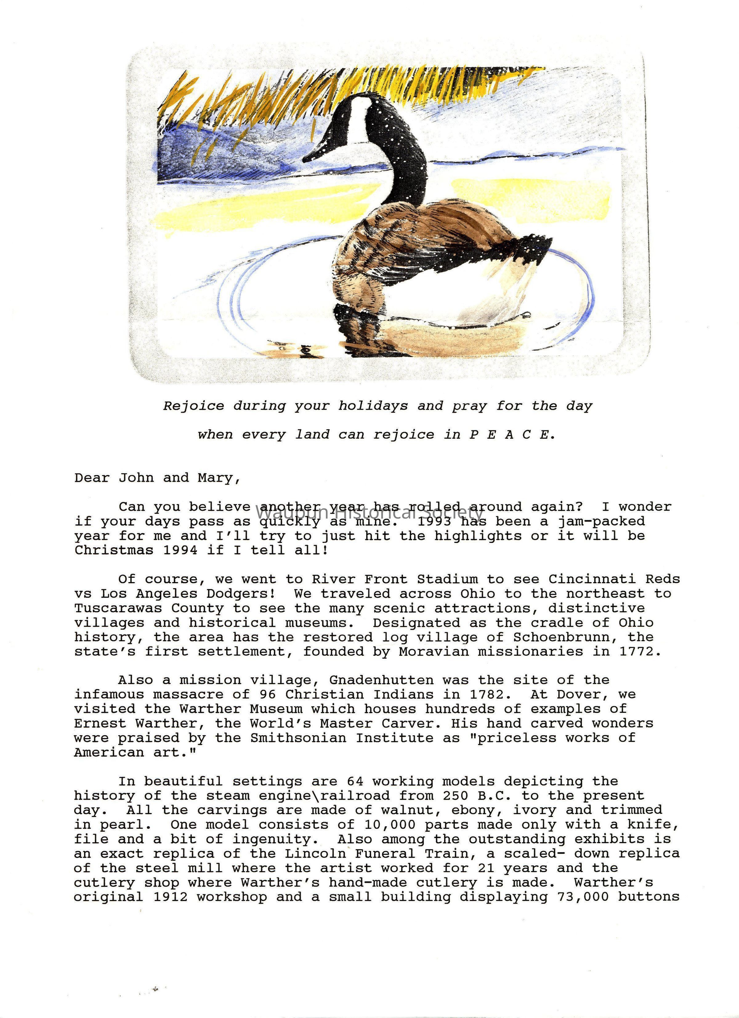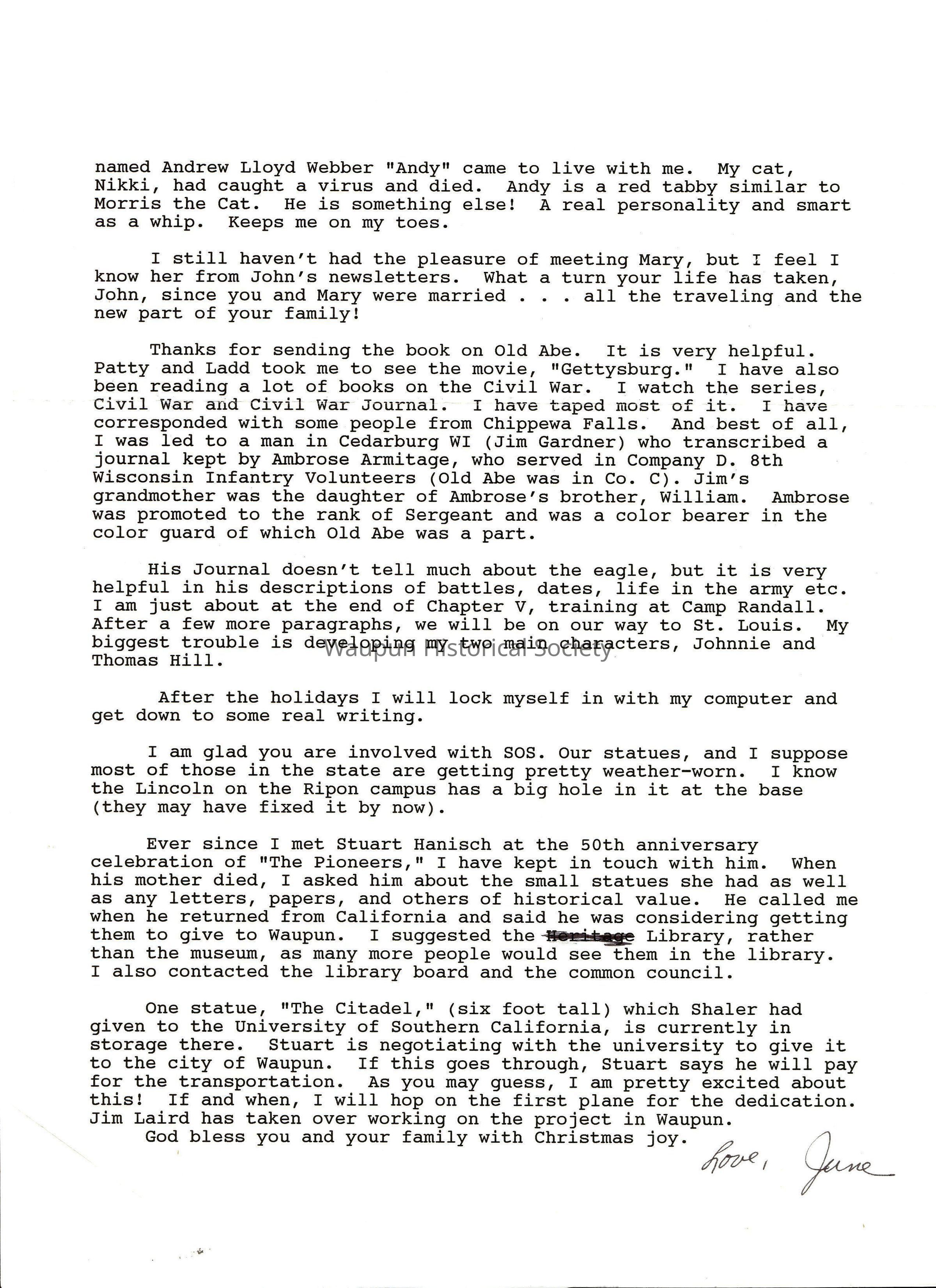 Letter from June Kelly dated Christmas, 1993. Interesting letter filled with historical facts and her travels around Ohio. She talks about writing her book on Old Abe, the Civil War Eagle of Co. C, 8th Wisconsin Infantry, and also about the Waupun statues. Meeting Stuart Hanisch and perhaps getting small statues, letters, papers and other items of historical value for Waupun. Also she mentions "The Citadel" statue (which now stands outside the Waupun Heritage Museum) which was in storage at the University of Southern California. Stuart Hanisch was instrumental in getting this returned to Waupun. Includes on the top of the first page a hand-painted goose.Acquisition