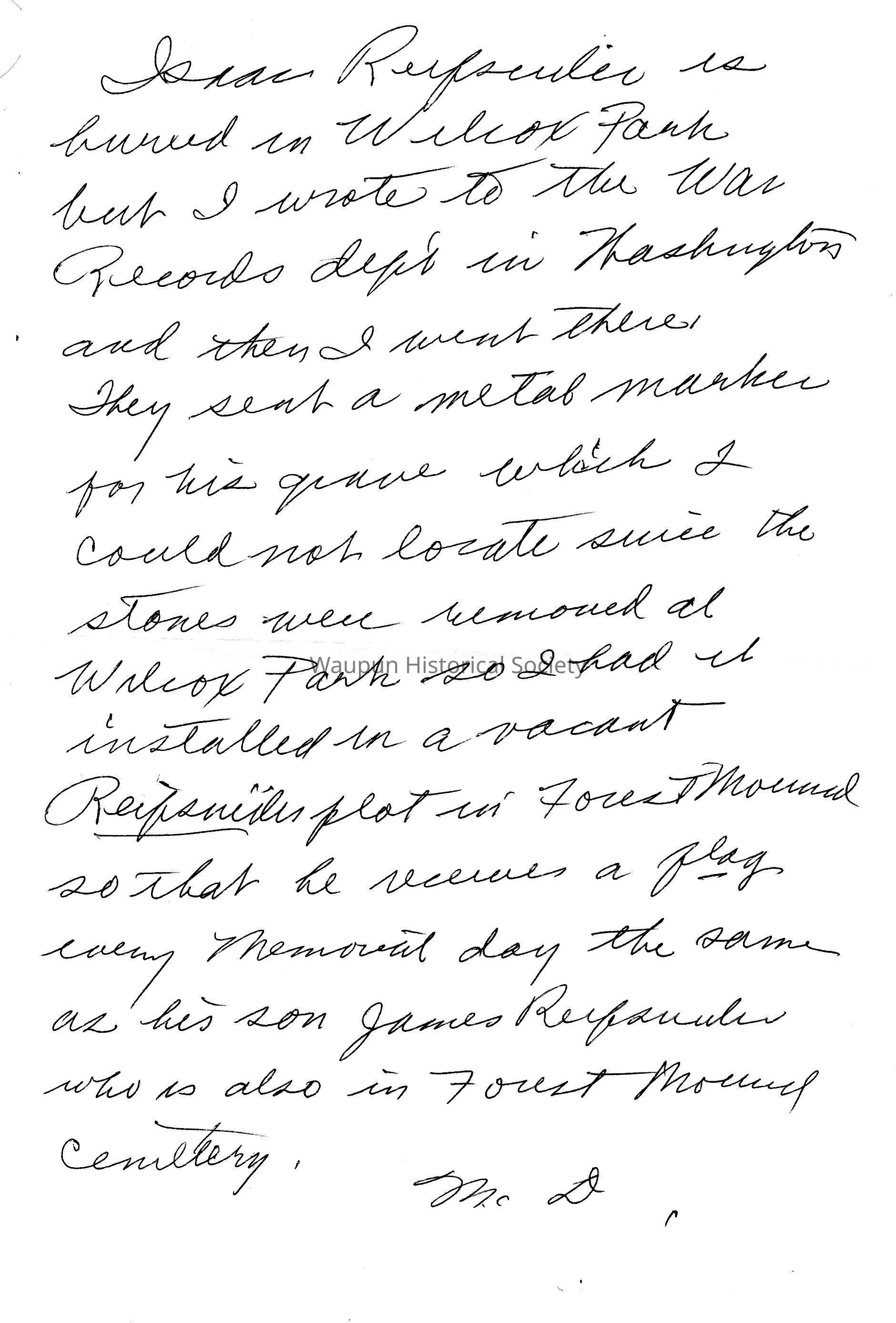 Isaac Reifsnider is buried in Wilcox Park, but I wrote to the War Records Dept. in Washington and then I sent there. They sent a metal marker for his grave which I could not locate since the stones were removed at Wilcox Park – so I had it installed in a vacant Reifsnider plot in Forest Mound so that he receives a flag every Memorial Day, the same as his son James Reifsnider who is also buried in Forest Mound Cemetery.