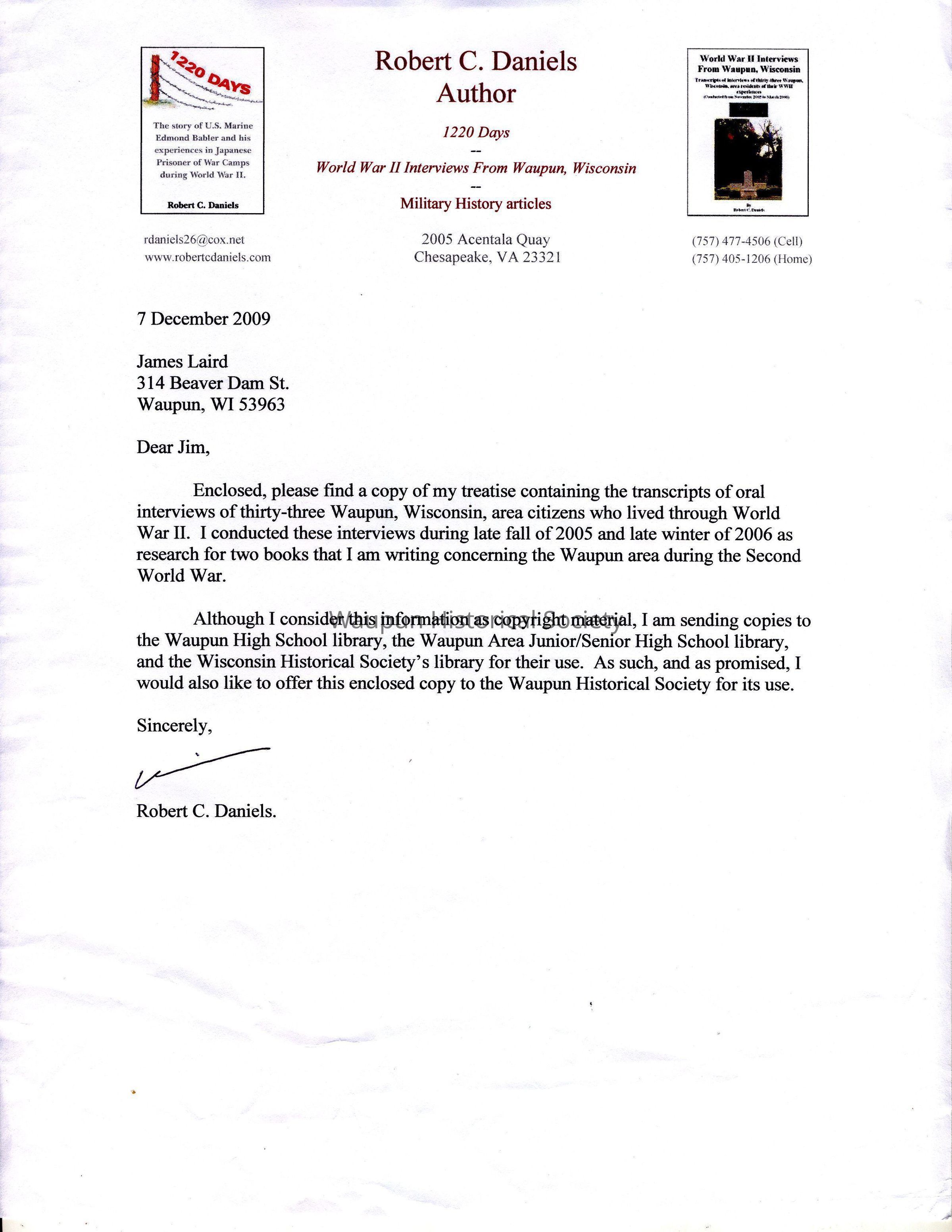 Letter, Robert Daniels, Transcripts of 33 World War II Area ResidentsEntry/Object ID
