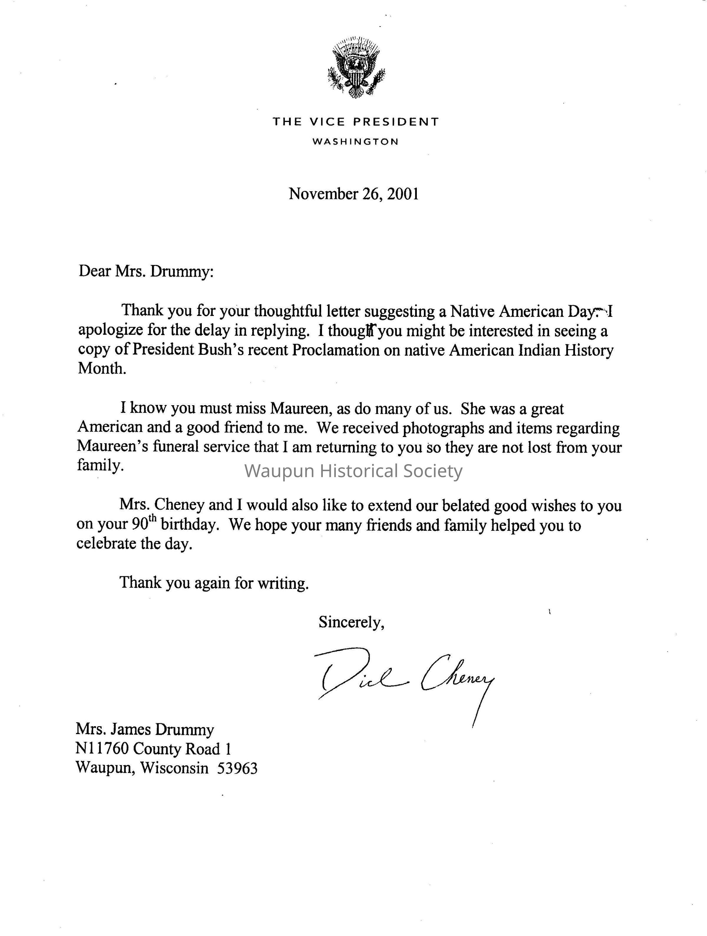 This is a letter sent by Vice President Richard Chaney to Mrs. Minnie Drummy. Minnie had sent President Bush a letter suggesting a Proclamation on Native American Indian History. Maureen Drummy was Minnie's daughter and she spend many years working in Washington D. C. Item 2001.0038.0002 is a copy of the proclamation signed by President George W. Bush.Acquisition