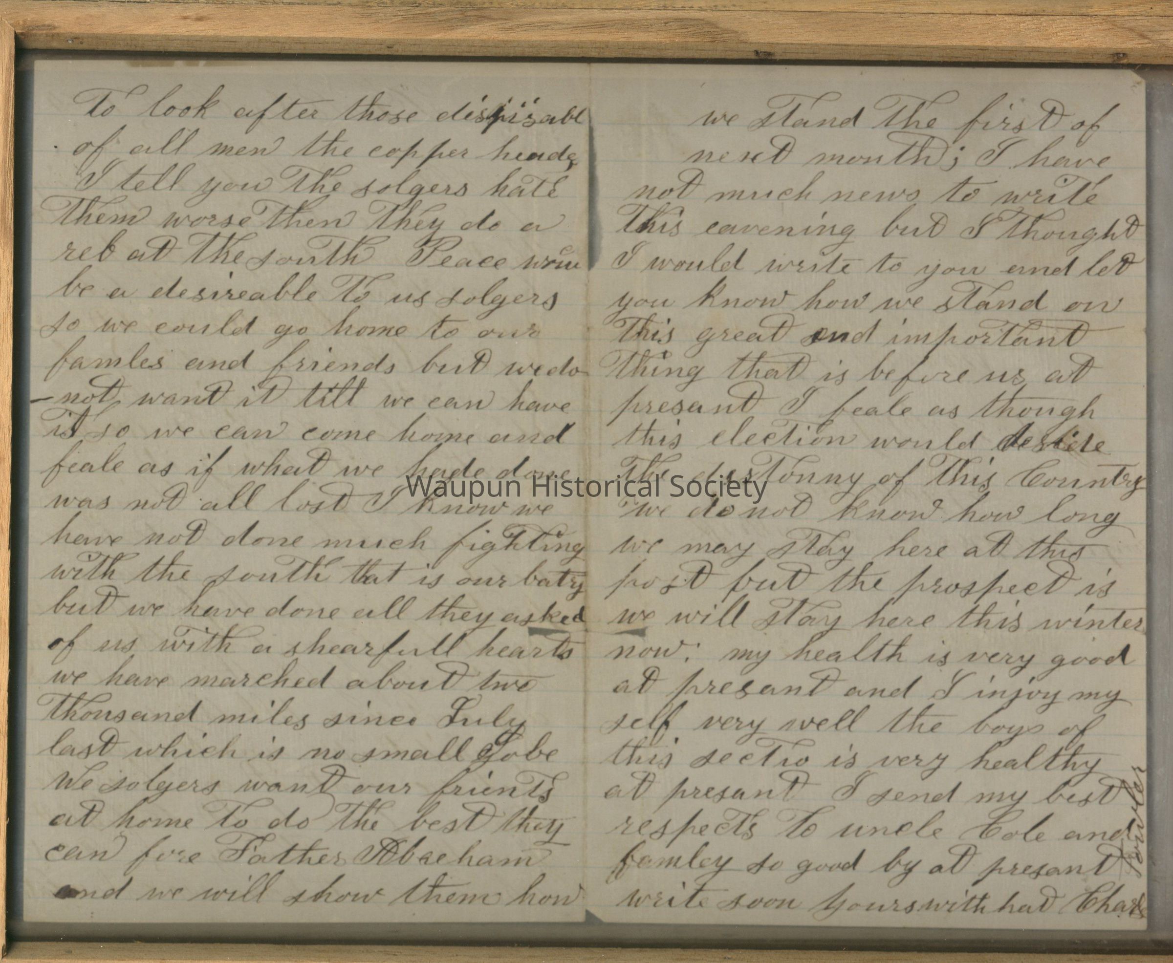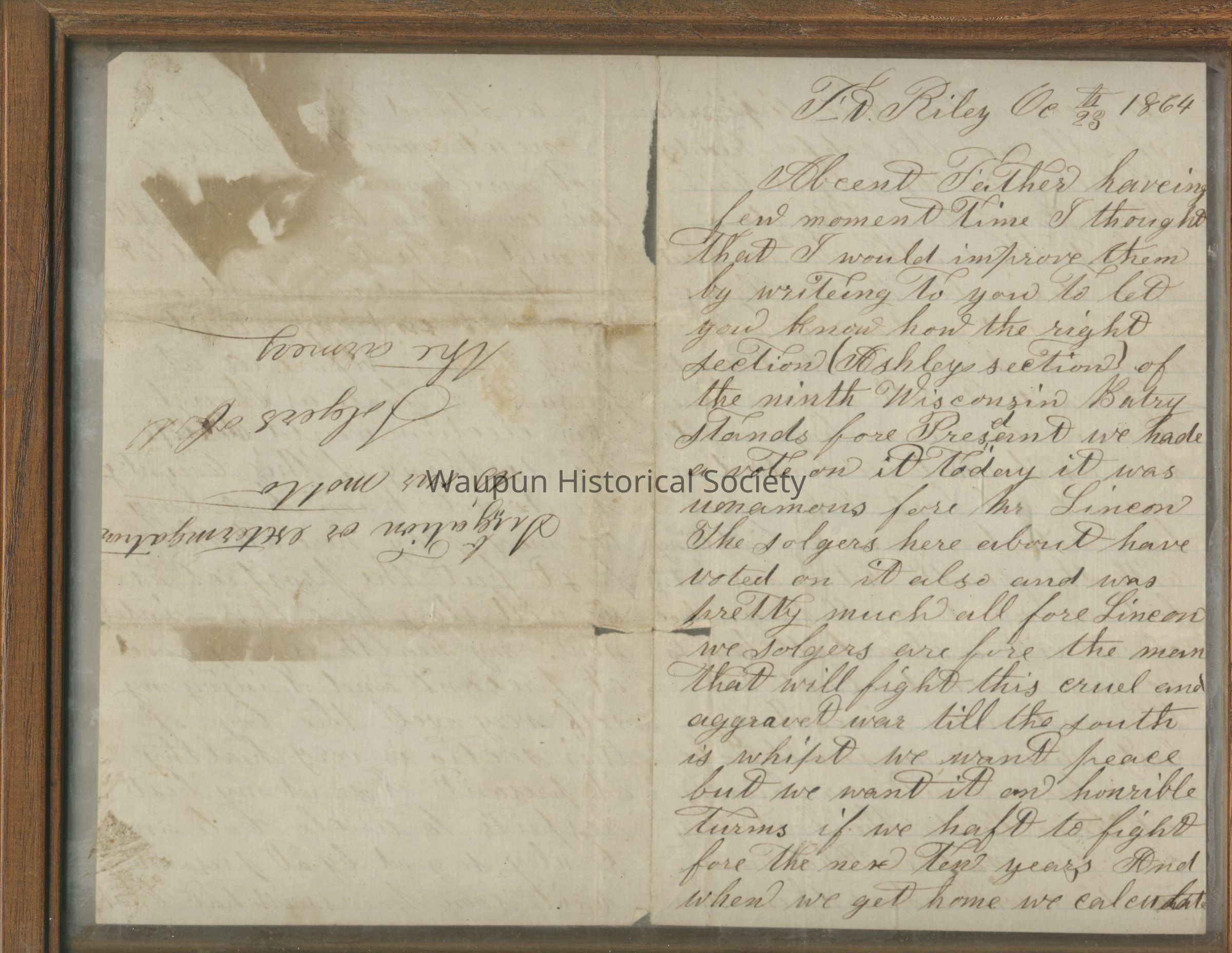 Civil War Letter Home. This letter, framed in an oak frame and double sided glass, is from Chas. Fowler to F. N. Riley on Oct. 23, 1864. In it he talks of the war, his support for the war, his fellow soldiers and his support for Lincoln.Acquisition