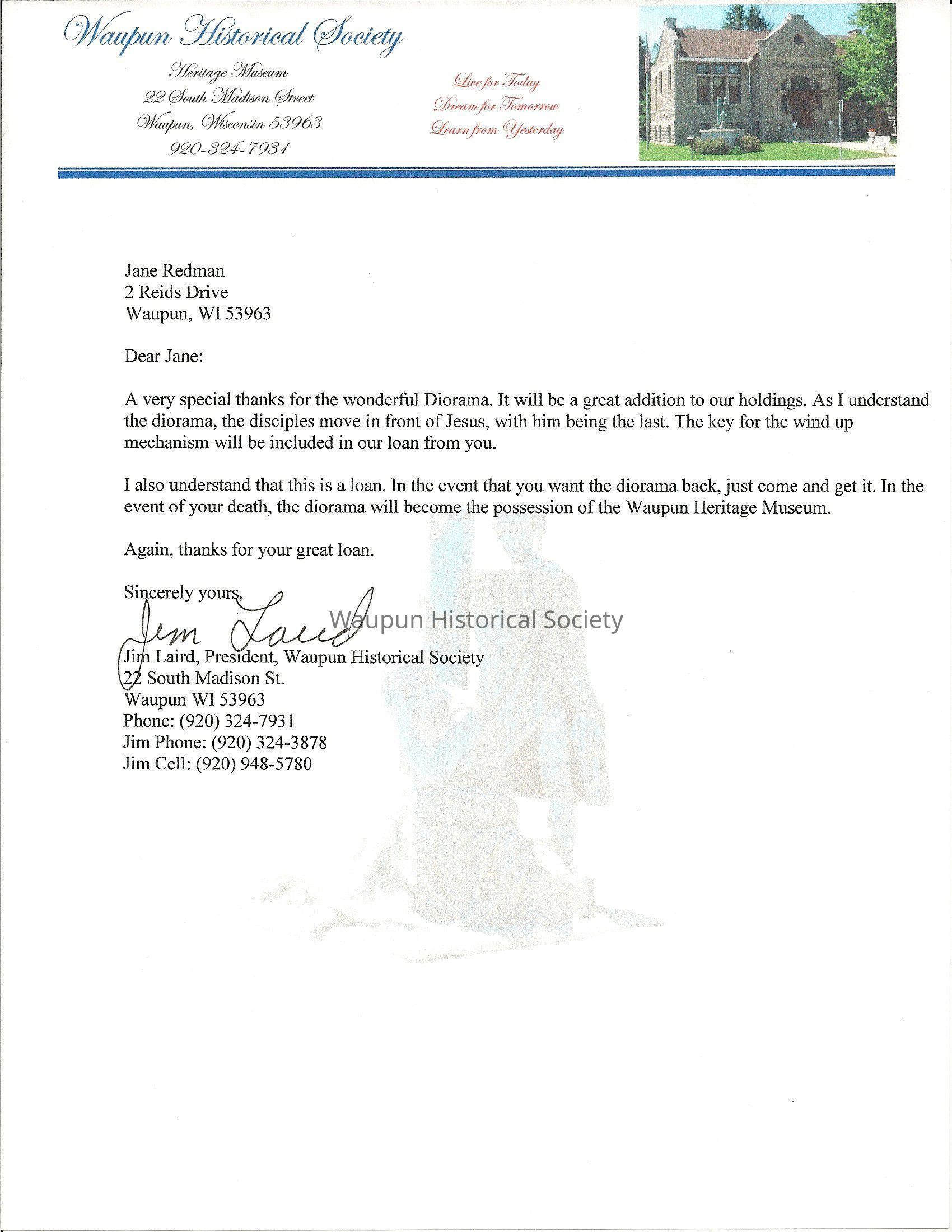 Letter, Waupun Historical Society to Jane Redman, Diorama, Jesus and DisciplesEntry/Object ID