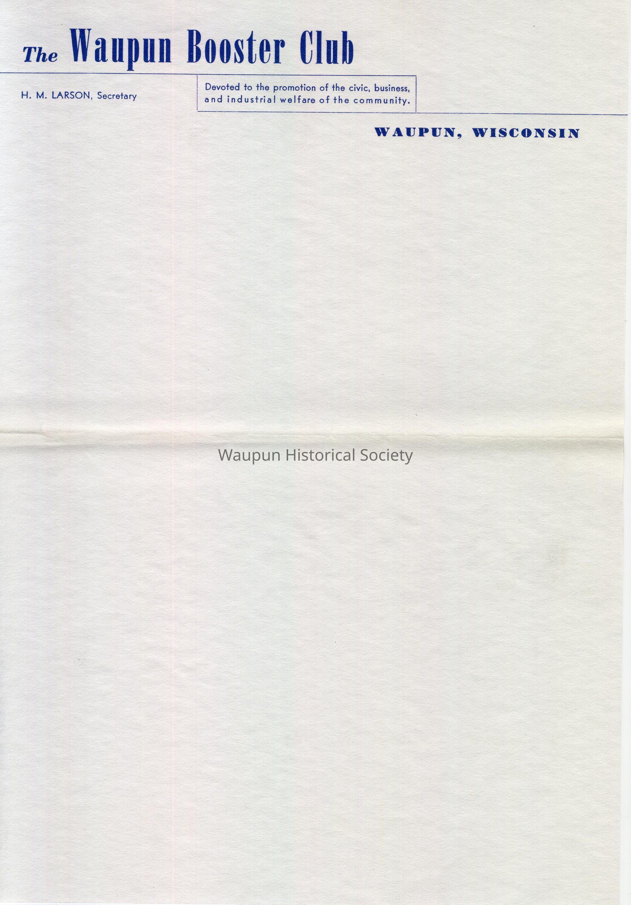 Waupun Booster Club, H.M. Larson, Secretary. Devoted to the promotion of the civic, business, and industrial welfare of the community. Waupun, Wisconsin. According to the city directory, Harold M. Larson was an insurance agent in 1940 and by 1947, was the manager of the High School cafeteria. The Larson's address was 529 E. Lincoln. By 1950, Larson was secretary of the Waupun Chamber of Commerce.Acquisition