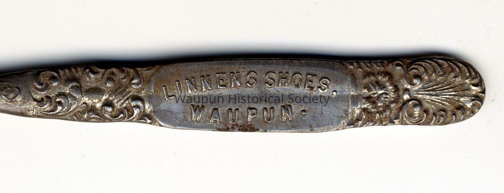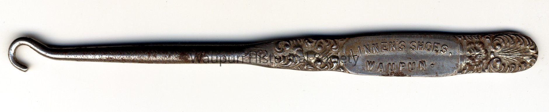 Metal Button Hook with Linnen's Shoes, Waupun on both sides of the handle. It is 6" long.Acquisition