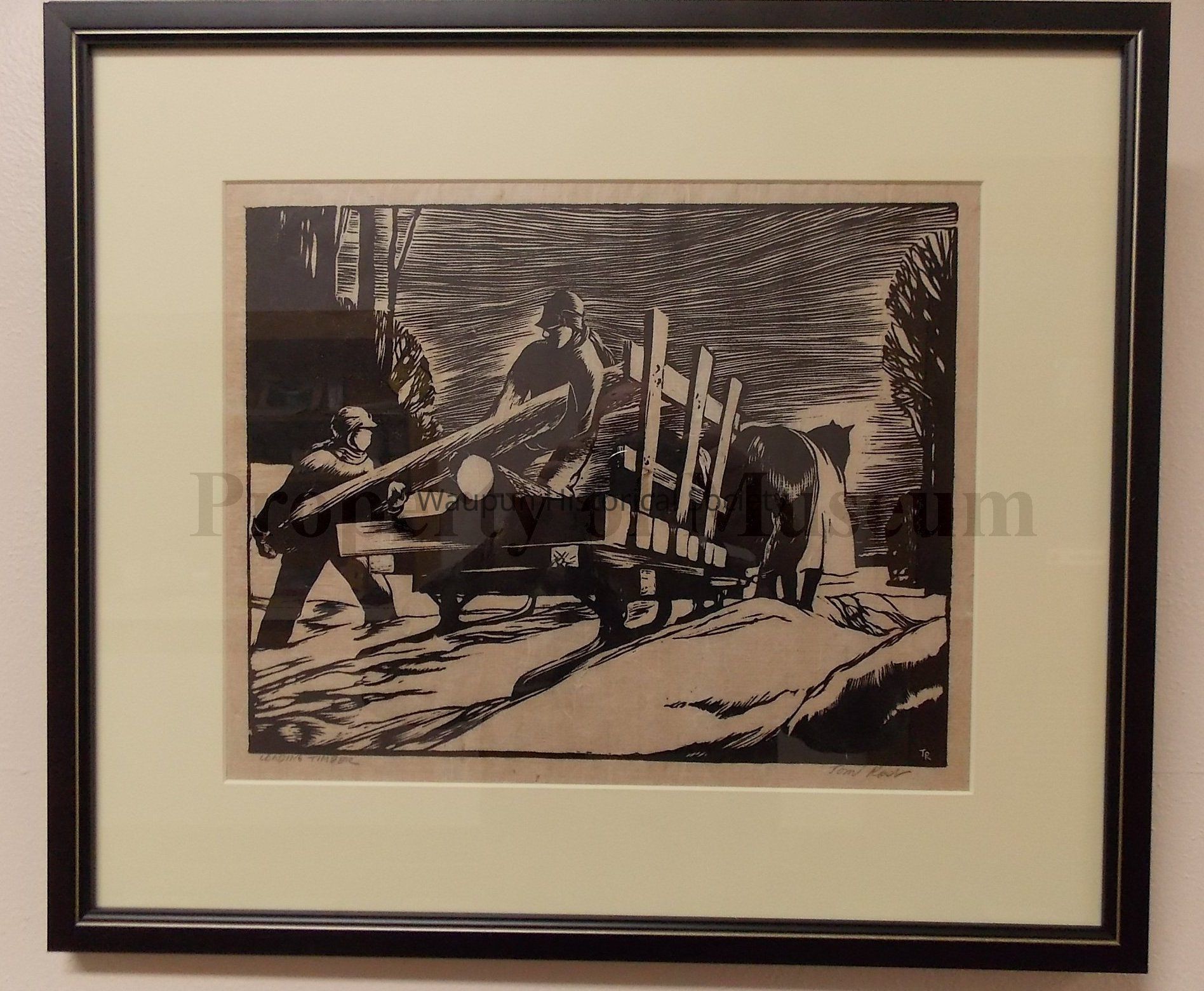 Wood block print, black on tan background, black frame, under glass; 2 men loading logs onto a wagon. By Tom Lee Rost