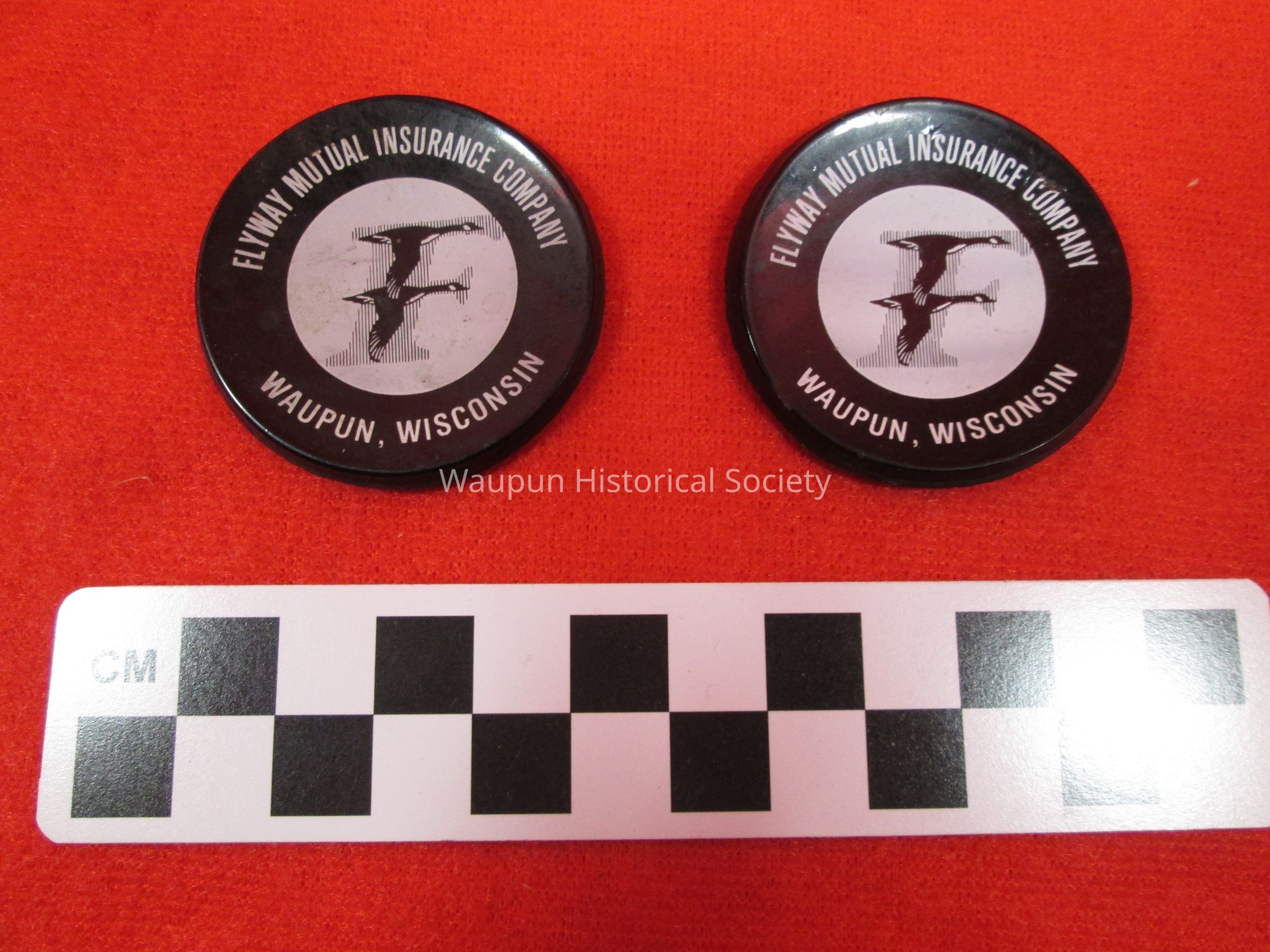 2 - magnets advertising Flyway Mutual Insurance Company, Waupun, Wisconsin. They are round, black and white with 2 geese in flight.Acquisition