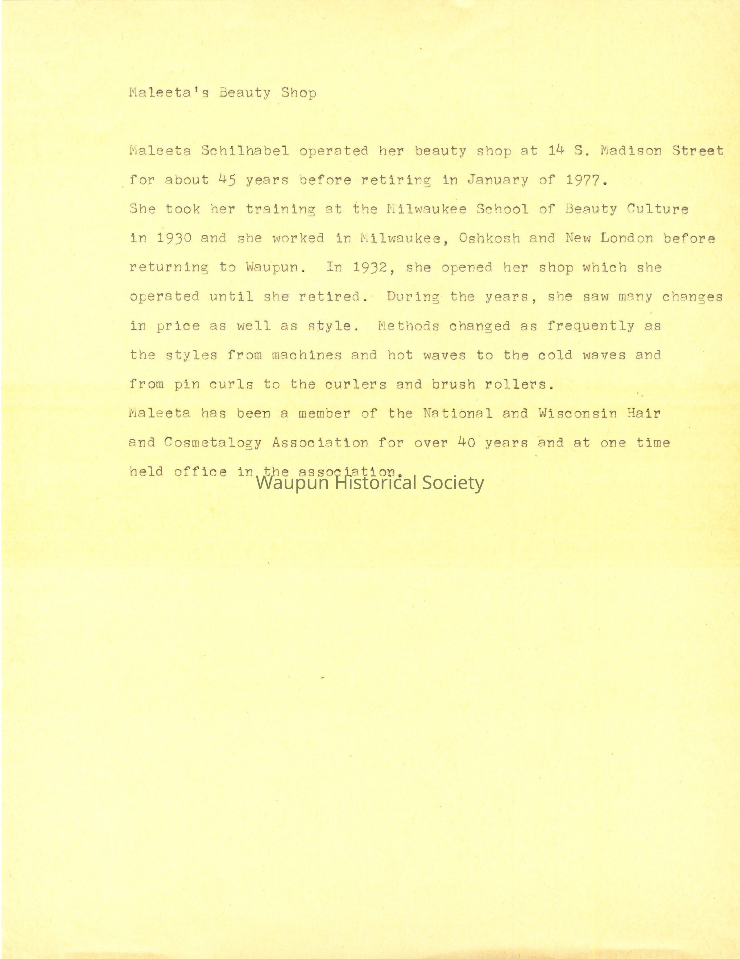 Historical information on Maleeta's Beauty Shop for 1976 Bicentennial Celebration in Waupun, WI.
