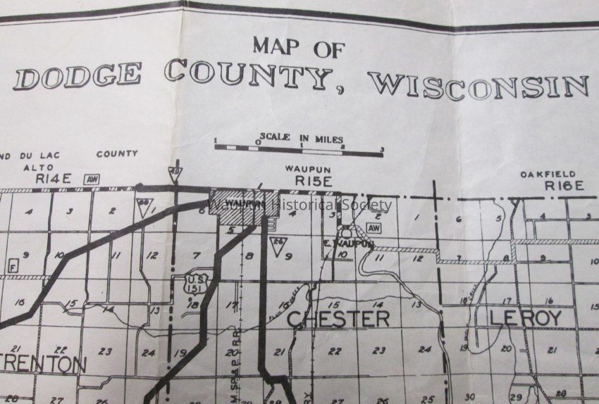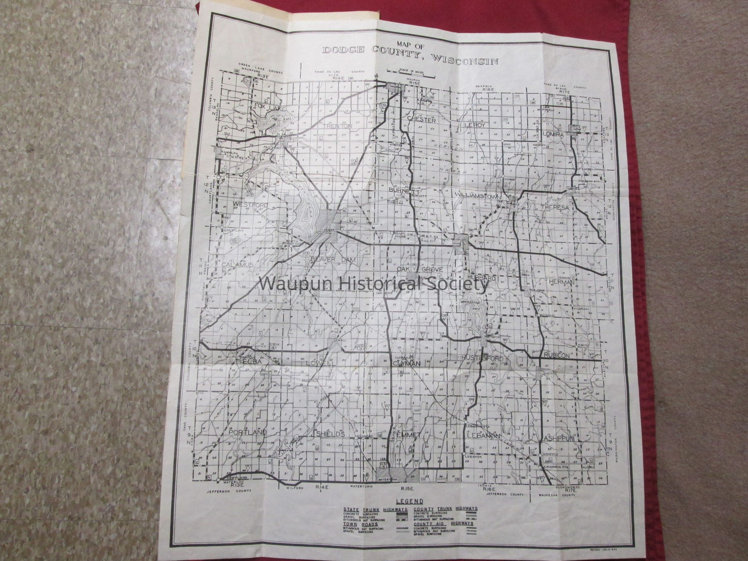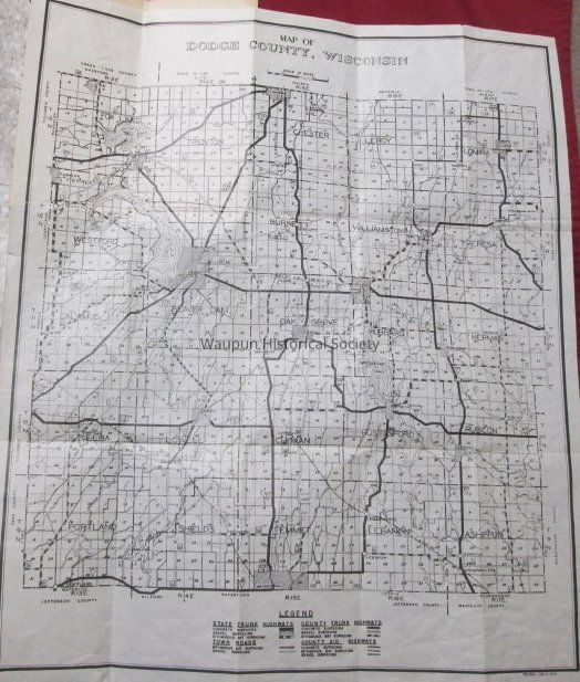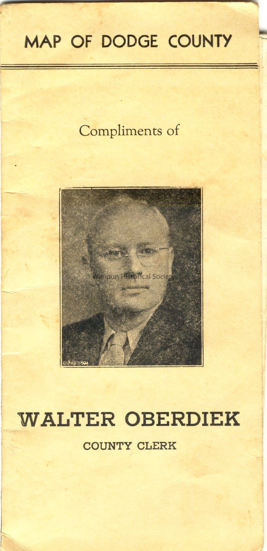 Map of Dodge County, Compliments of Walter Oberdiek, County Clerk. It is folded to appear to be a pamphlet so will take photos of it open and file in museum photo files upstairs at Carnegie Museum. A photo of Walter Oberdiek is on the front. There is no date indicated anywhere on the map.Acquisition