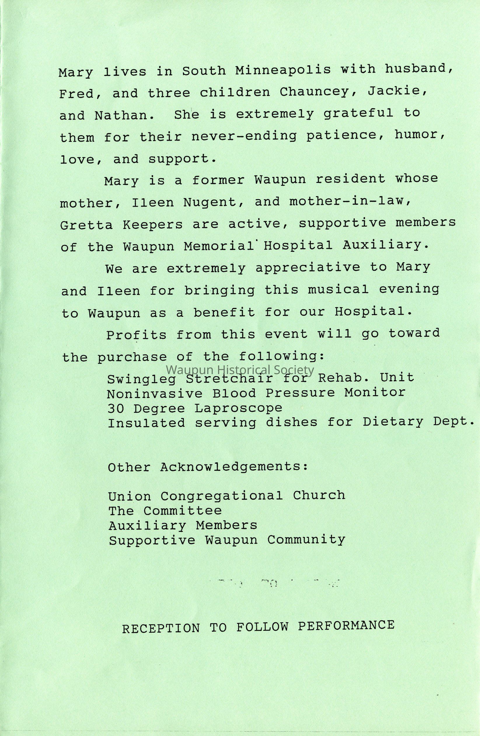 We are extremely appreciative to Mary and Ileen for bringing this musical evening to Waupun as a benefit for our Hospital.