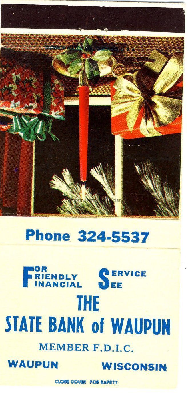 Matchbook advertising Waupun business - The State Bank of Waupun Member F.D.I.C. Waupun, Wisconsin. Phone 324-5537