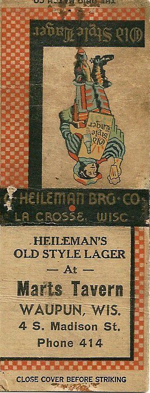 Matchbook from Marts Tavern. Marts Tavern was at 4 South Madison St. Its phone number was 414, so the matchbook was prior to 1961. It indicates: Heileman's Old Style Lager at Marts Tavern, Waupun, Wis., 4 S. Madison St., Phone 414, Close Cover Before Striking, Heileman Bro Co, La Crosse, Wisc., Old Style Lager." Marts was operated by listed in the 1940 city directory and it indicates that M. Bristoll was the proprietor. His first name is not listed in the directory.Acquisition