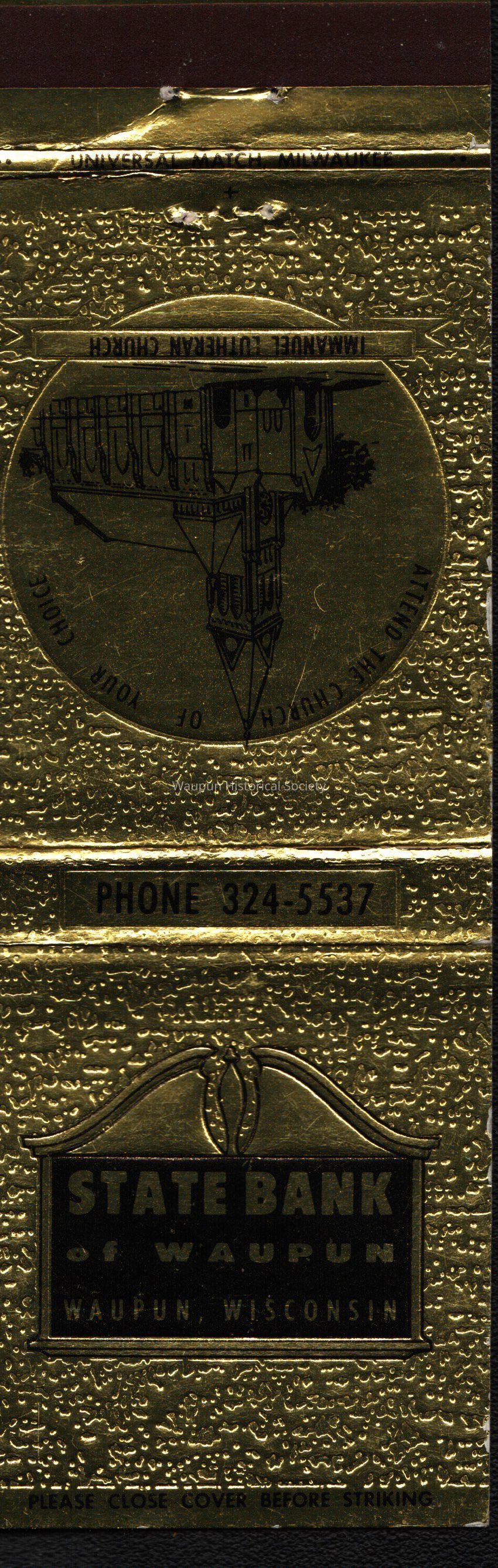 Matchbook, State Bank, Immanuel Lutheran Church