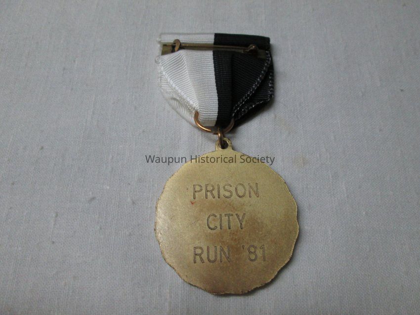 Commemorative Pin Medal of Prison City Run of "81 gold in color with two lady on the front of the madel running with a Black& White Stripe Pin.Acquisition