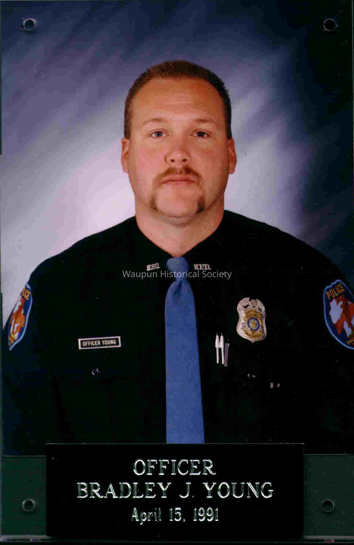 This is part of a series of photos that appeared in the Action Advertiser on May 15, 2002. The article was in recognition of Police Week, May 12-18. The actual article is scanned as item number 2001.0030.0051a and 2001.0030.0051b. Brad Young is listed as an Officer.
