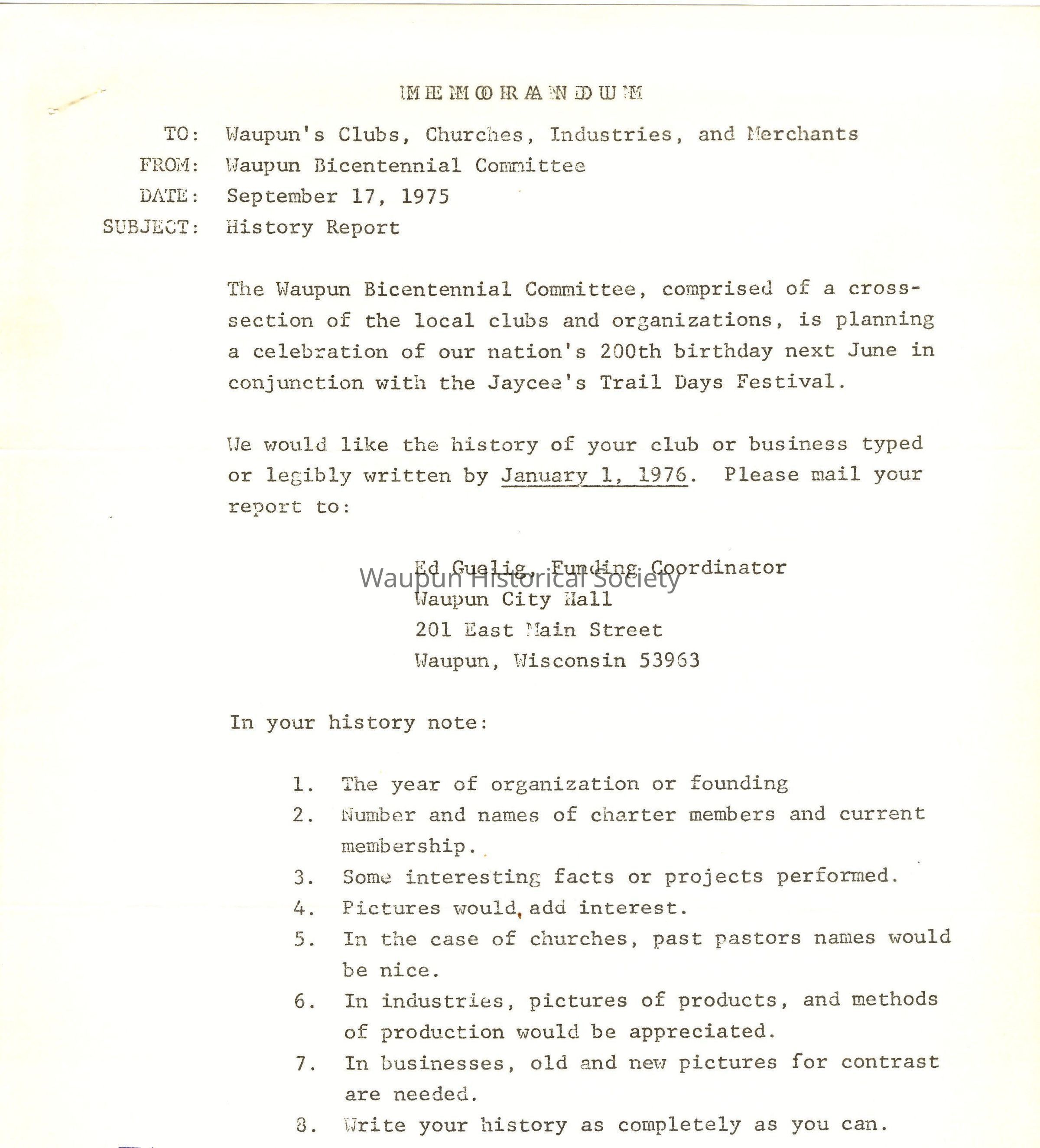 Per the request of June Kelly, who was on the Leader News staff, a memorandum was issued to Waupun clubs, churches, industries and merchants requesting history of club, or business for the LeaderNews paper for the Waupun Bicentennial celebration of 1976.