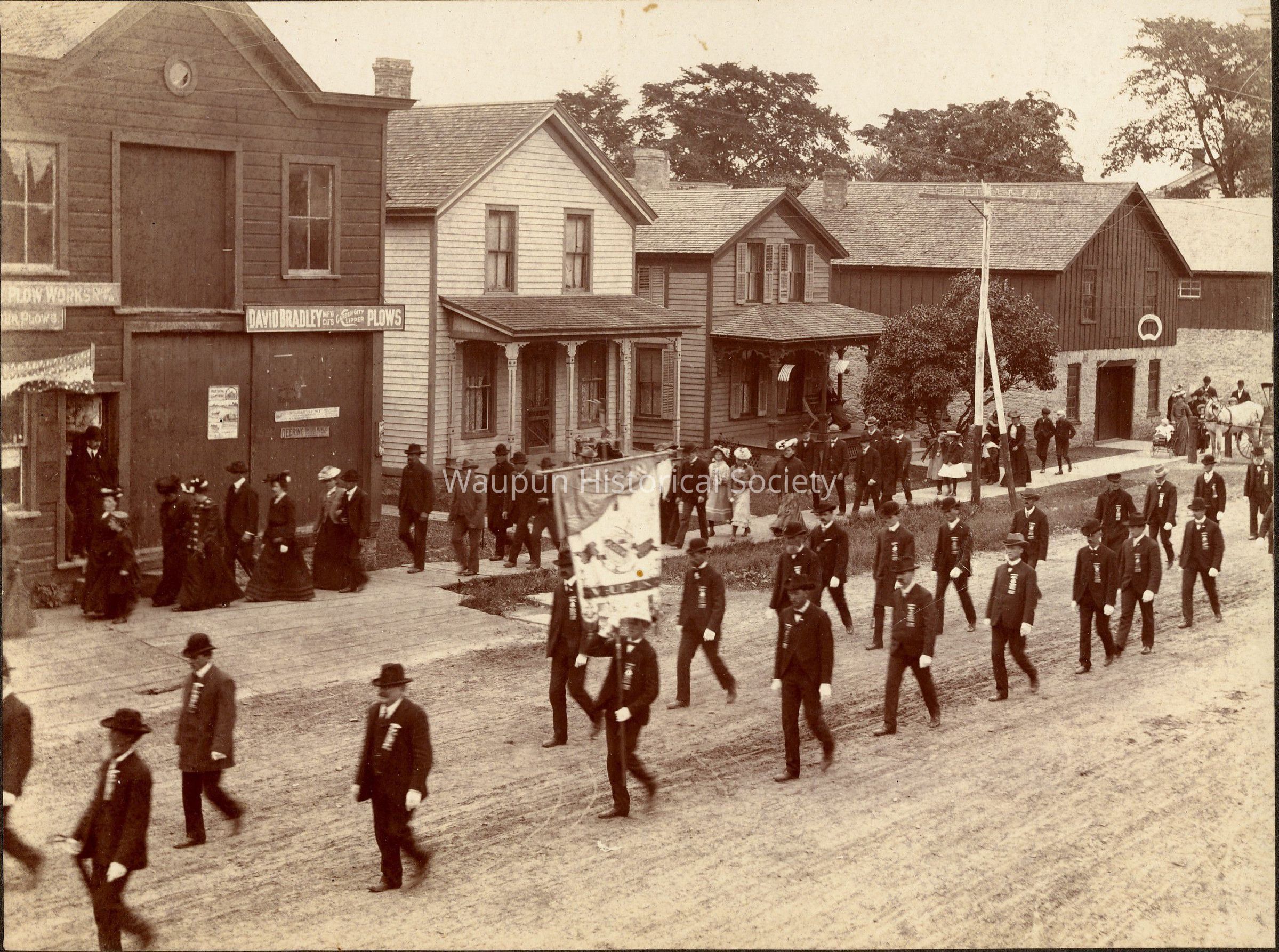 Photo of a Memorial Day Parade, (unsure of date) passing the five buildings which have been torn down between E Main St. and E Franklin on North Madison street. The blacksmith shop was remodeled and is the building containing the offices of John deHartog and Glen R. Wilson.