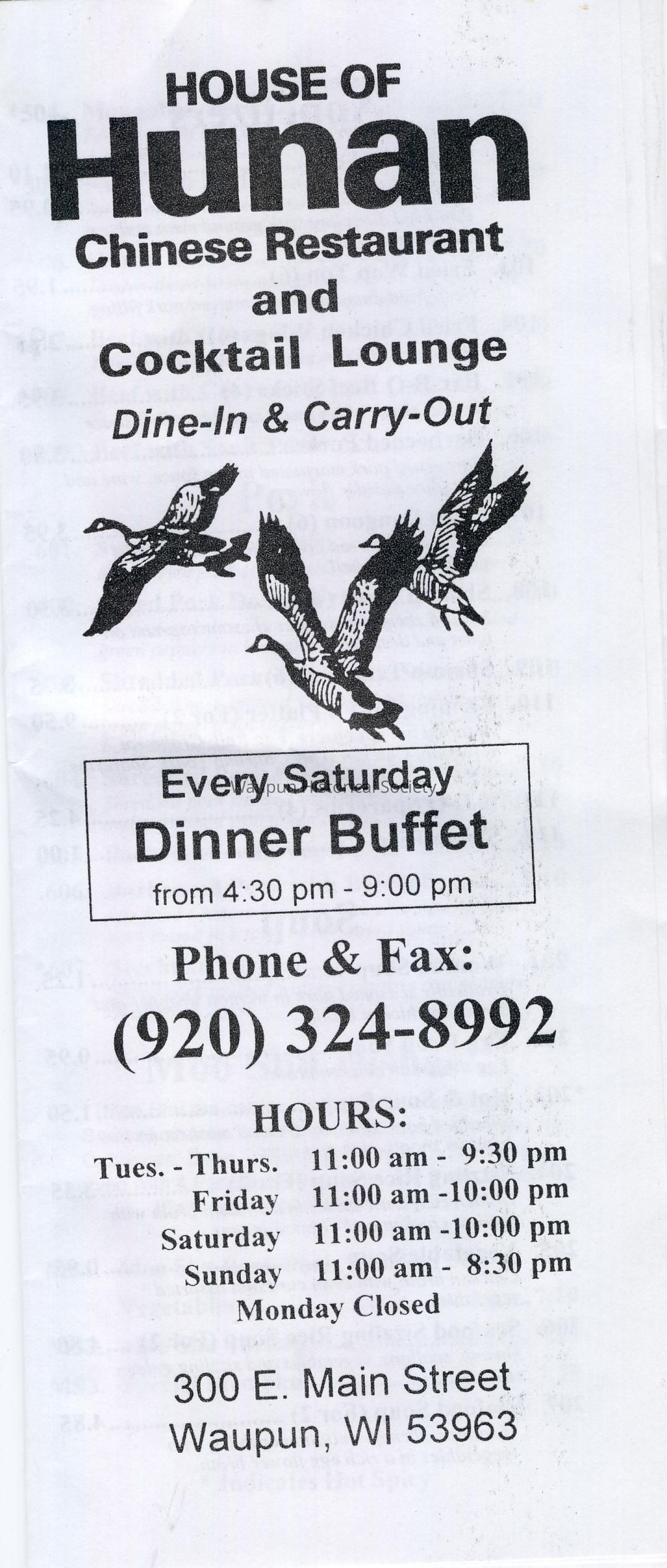 House of Hunan Chinese Restaurant and Cocktail Lounge, Dine-In & Carry-Out. 300 E. Main Street, Waupun, WI 53963. No date given.Acquisition