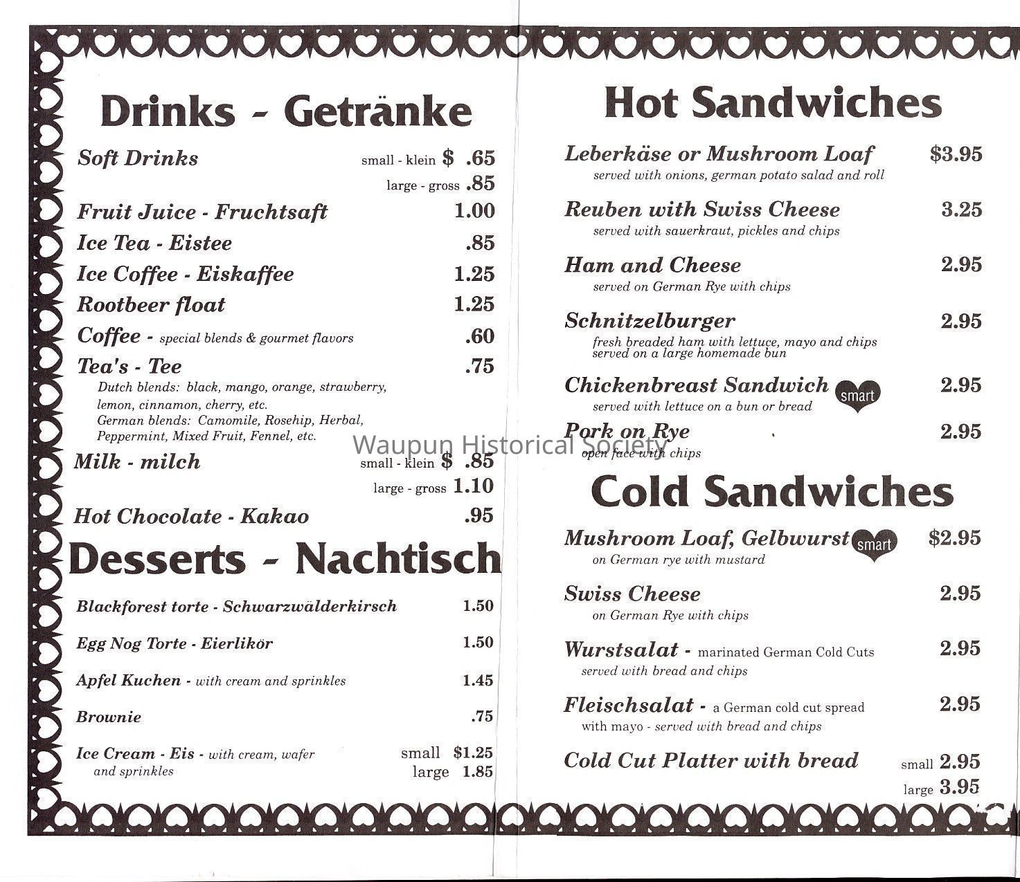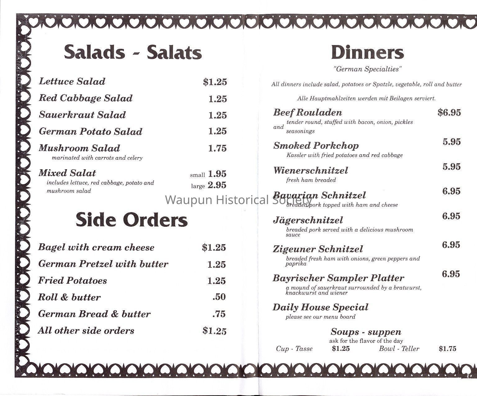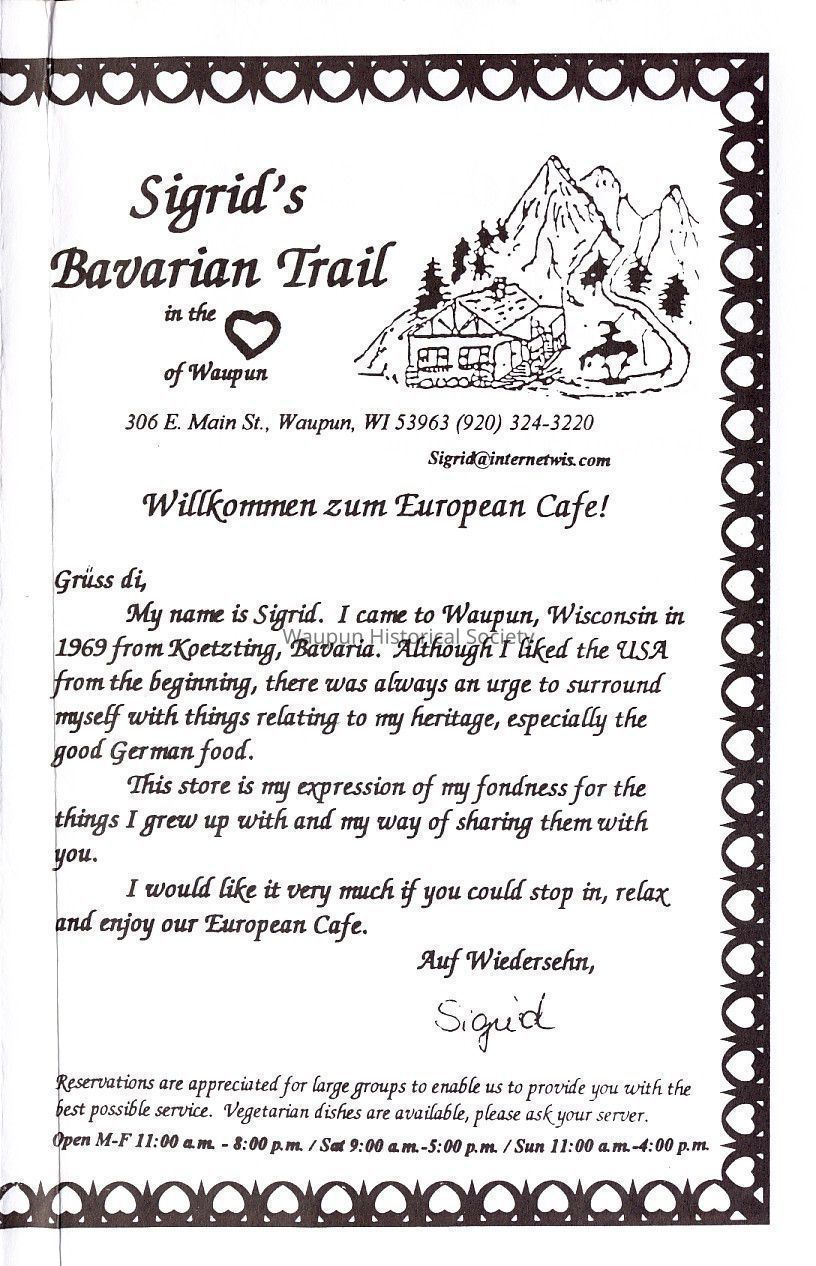 Sigrid's Bavarian Trail menu. Sigrid Bronkhorst operated Sigrid's Bavarian Trail at 306 East Main Street in Waupun for several years. It was a combination gift shop, tourist information location, and cafe. She specialized in German Barvarian Food.Acquisition