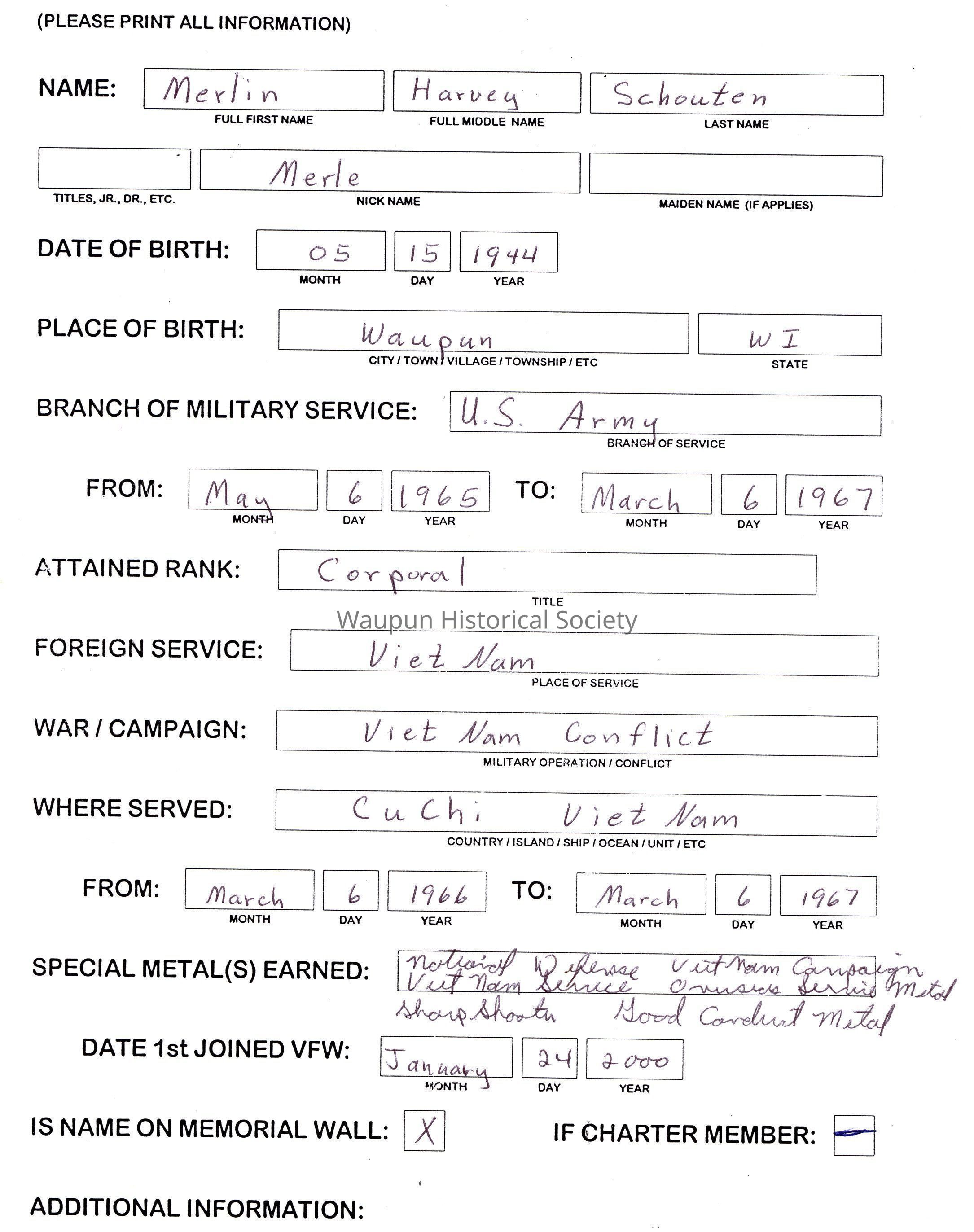Merlin was born May 15, 1944 in Waupun WI. He served in the U. S. Army from May 6, 1965 with the rank of Corporal. Merle served during the Viet Nam Conflict in Cuchi. He was discharged March 6, 1967.