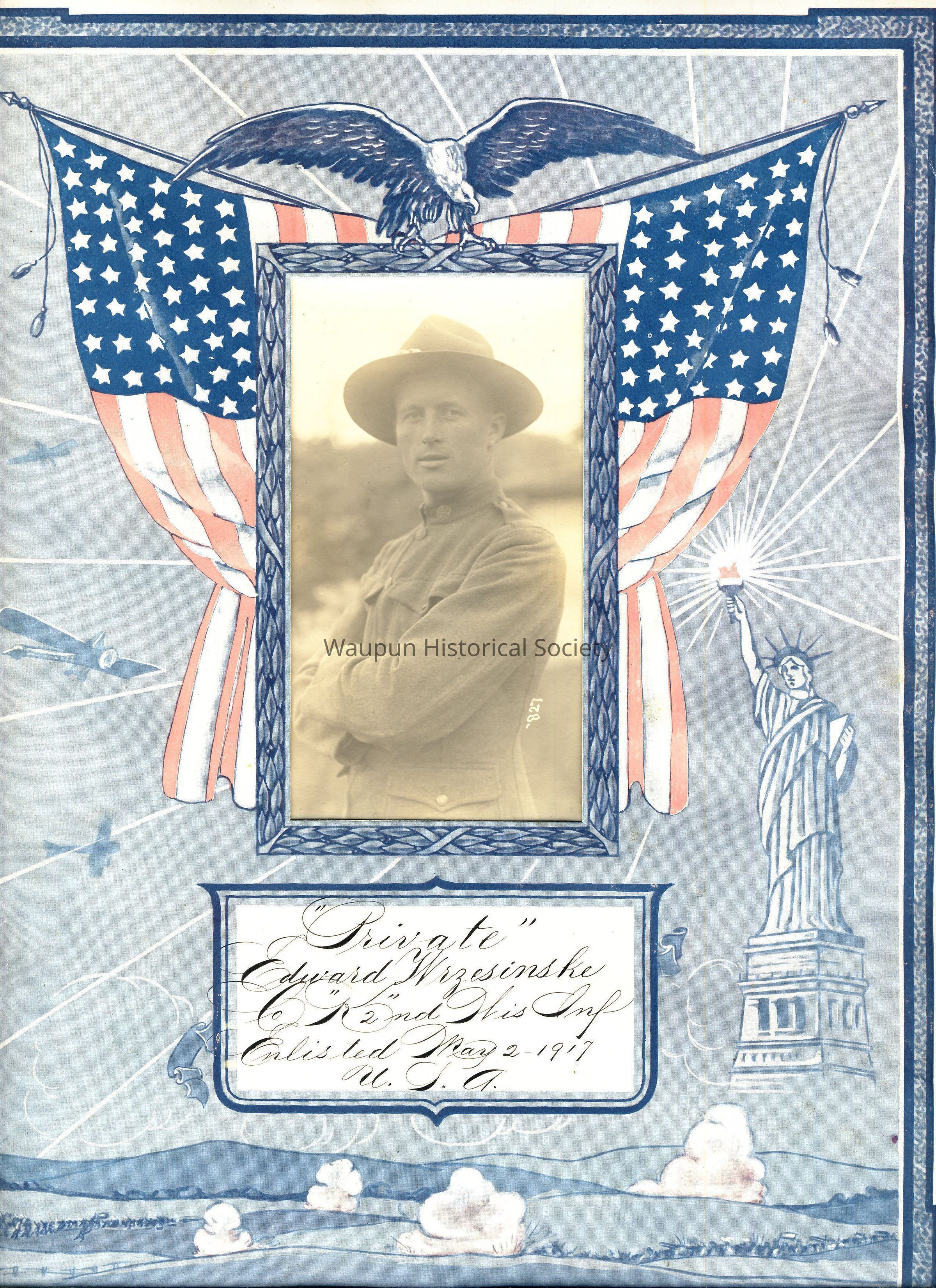 Enlistment photo postcard of Private Edward Wrzesinske which is taped and framed in a paper frame, red, white and blue in color. An eagle is between two American flags and the print of the statue of liberty and planes is on background of paper frame. The information - "Private" Edward Wrzesinske, Co "K" 2nd Wis Inf, Enlisted May 2, 1917, U. S. A. is hand printed in a boxed frame on paper frame, under the photo.