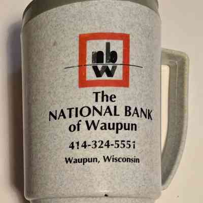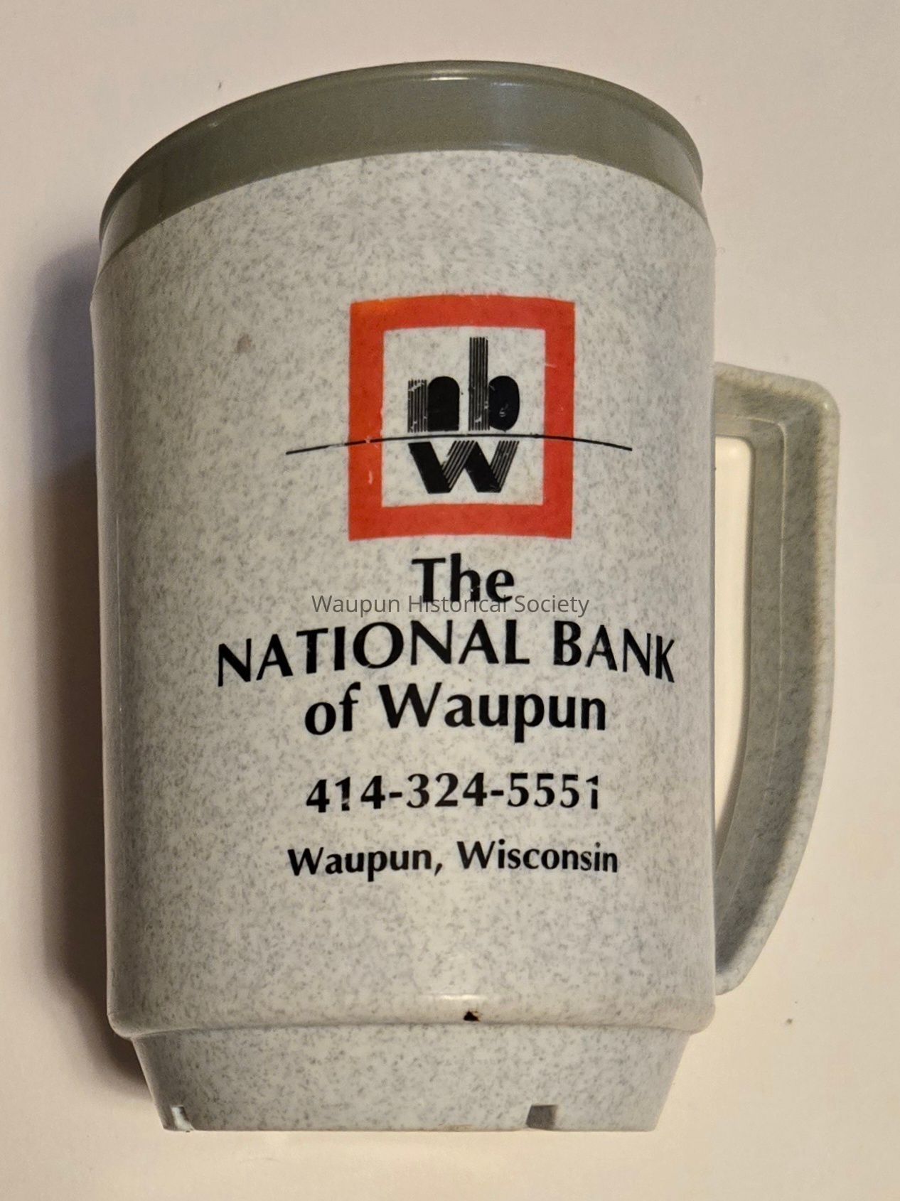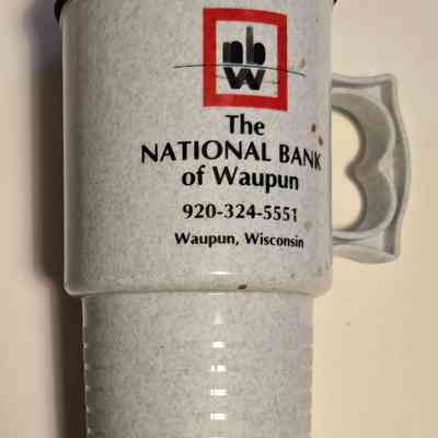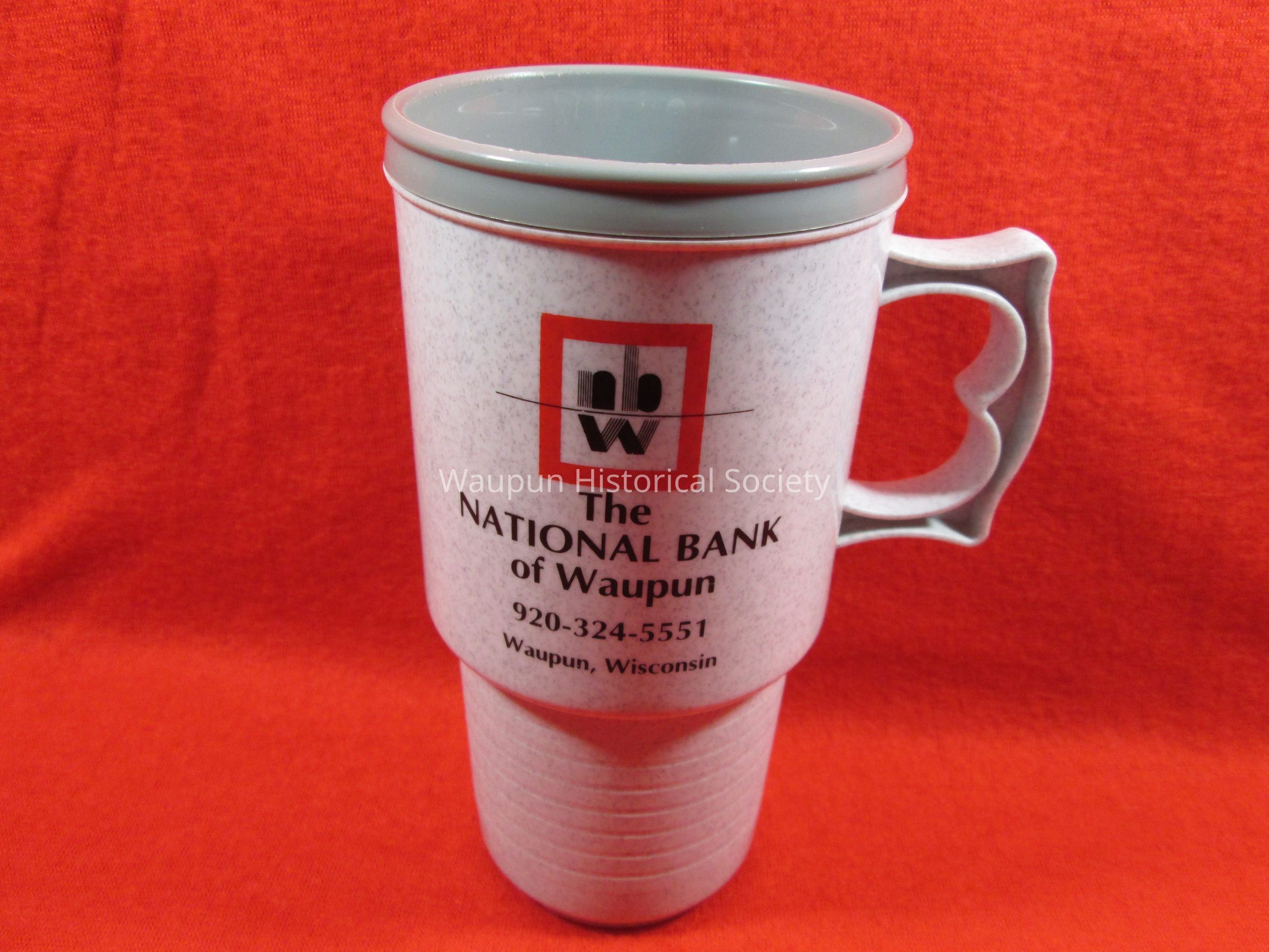 Light grey travel mug advertising The National Bank of Waupun, 920-324-5551, Waupun, Wisconsin. On the bottom it also has AutoMug, Travel Mug. There was no lid with the mug.Acquisition