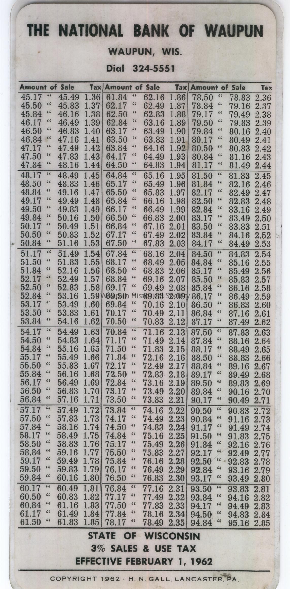 National Bank of Waupun Tax Table, 1962, State of Wisconsin 3% Sales & Use Tax, Effective February 1, 1962. Printed by H. N. Gall, Lancaster, PA. Laminated.