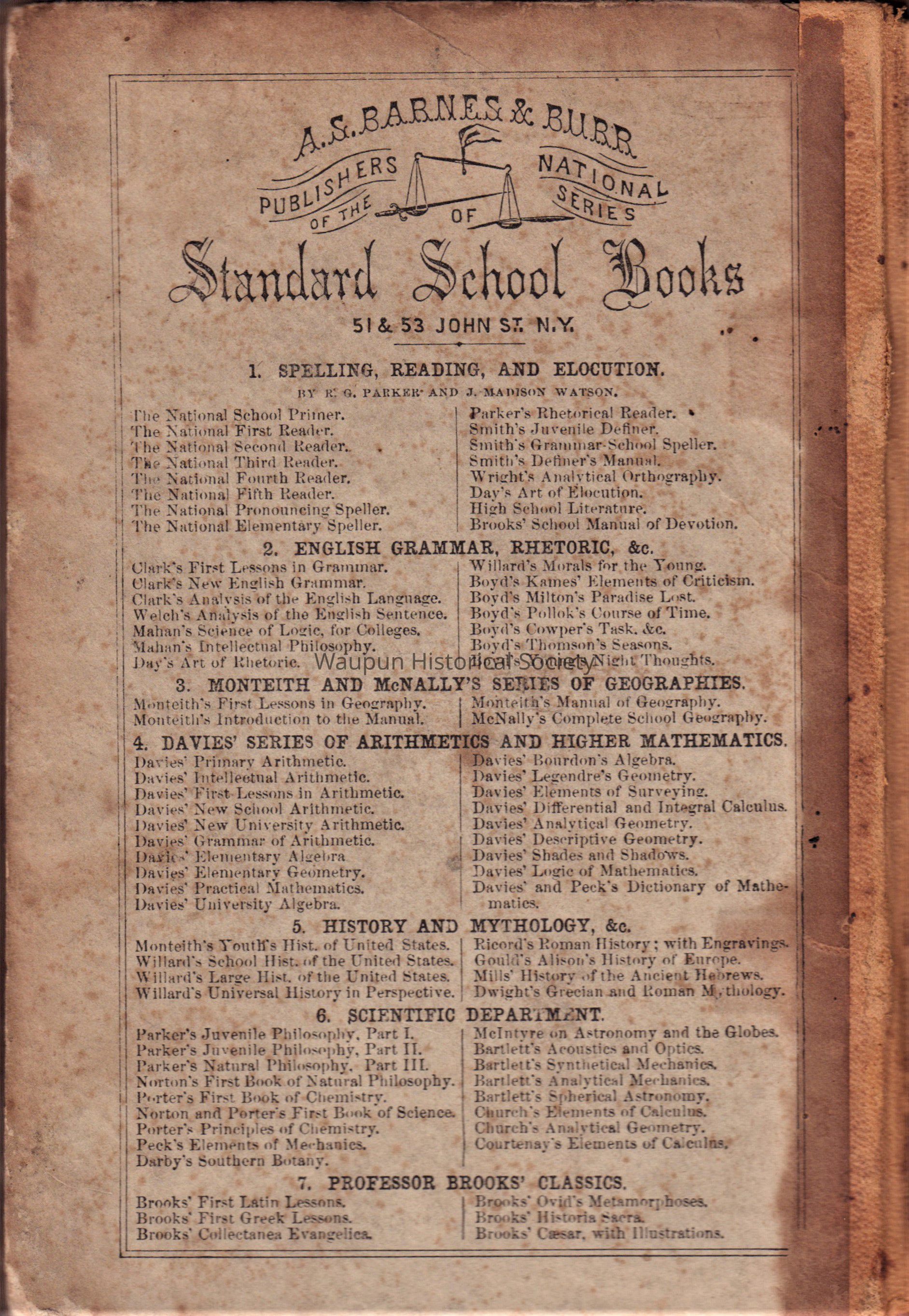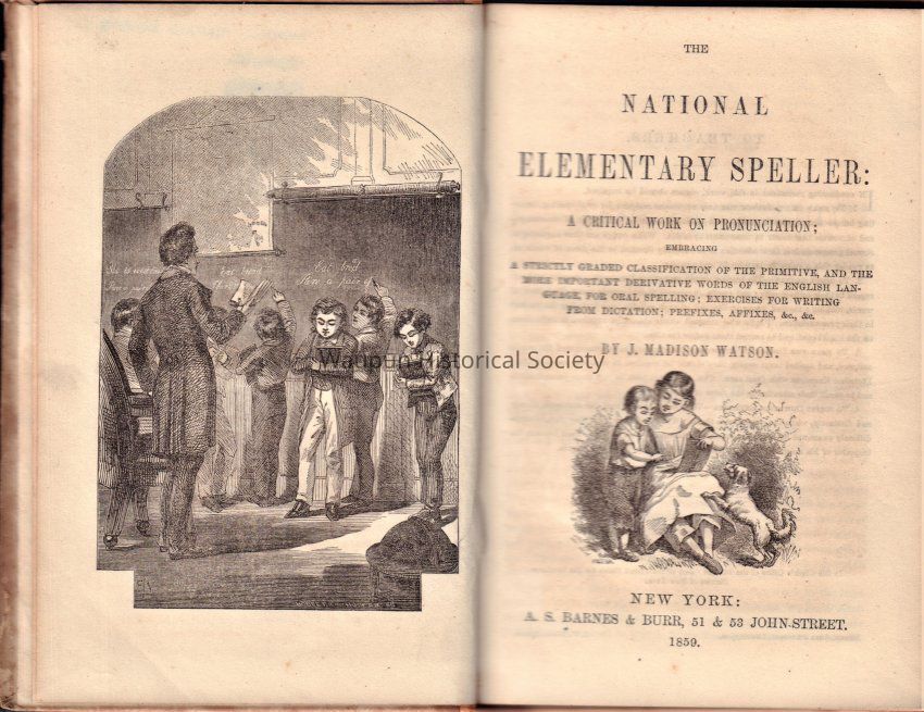(1859) BOOK /NATIONAL ELEMENTARY SPELLER /BROWN HARD BACK /NATIONAL ELEMENTARY SPELLER ON FRONT /white pages /black printing inside /160 pagesAcquisition