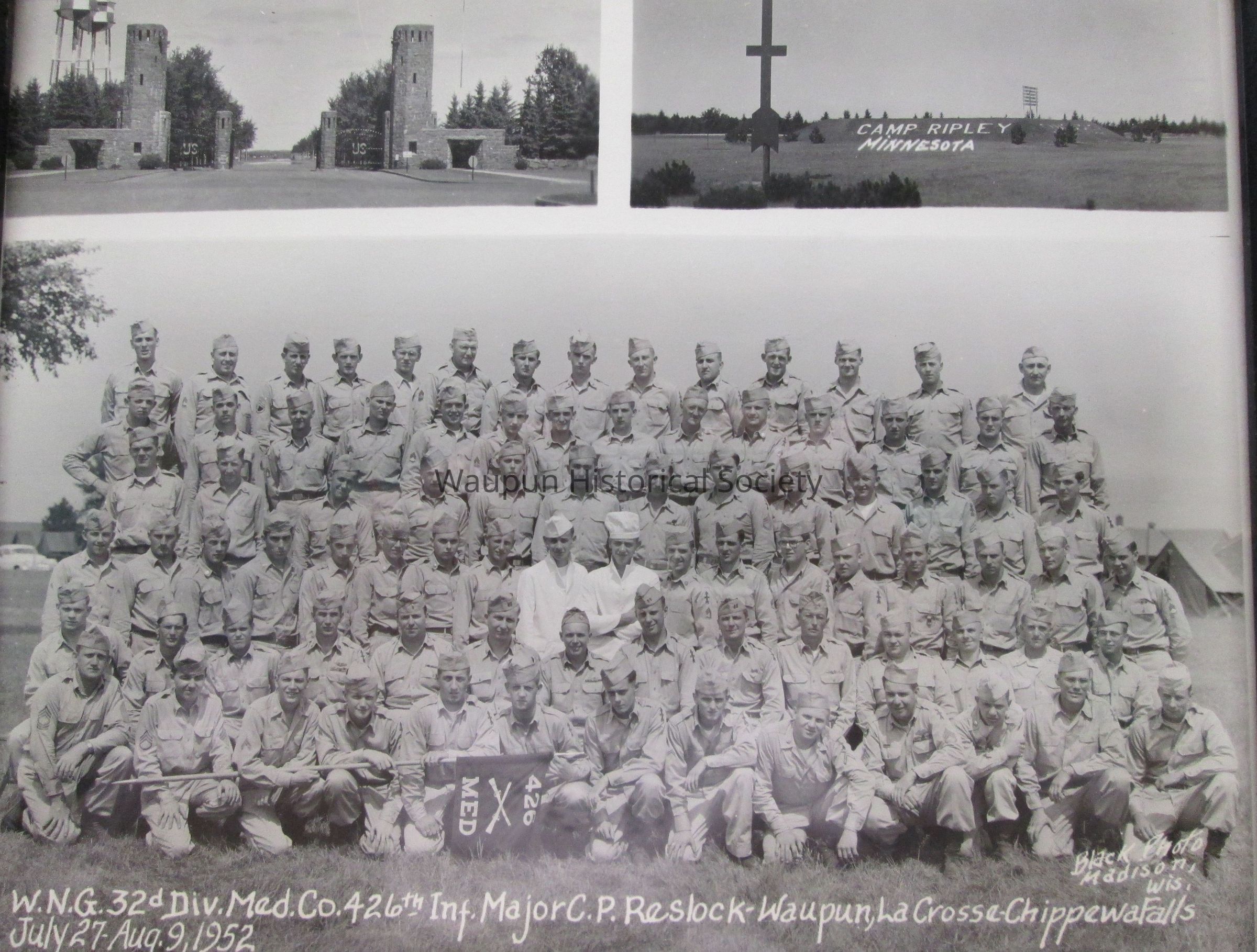 7.5" x 9.5" Black and white photo of W.N.G. 32nd Div. Med. Co. 426th Inf. Major C.P. Reslock-Waupun, La Crosse-ChippewaFalls July 27 - Aug. 9, 1952. The photo includes the gates of Camp Ripley in one photo, a picture of a hill inside Camp Ripley, MN, as well as a photo of the men who were there training the week of July 27th thru August 9, 1952.