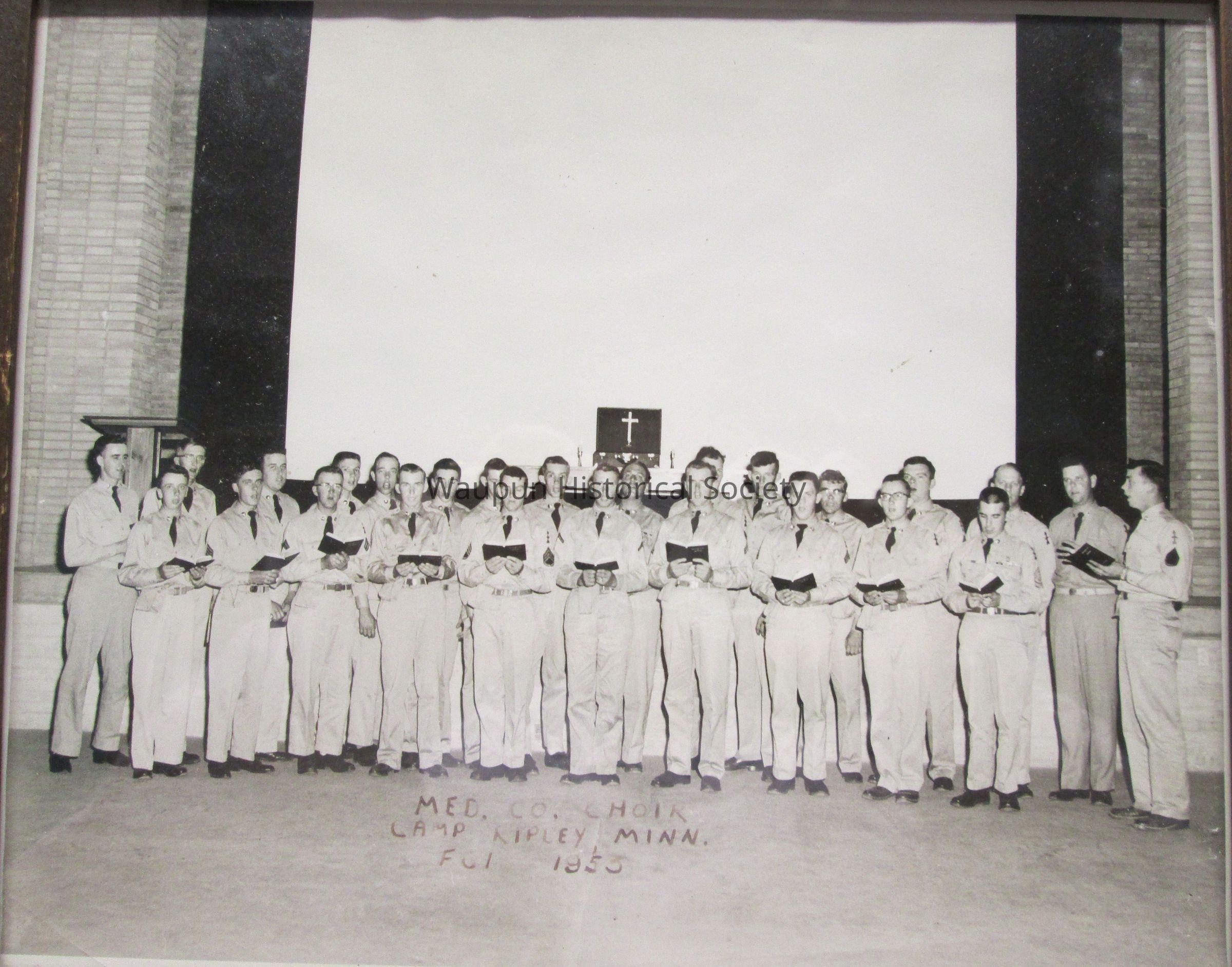 7.5" x 9.5" National Guard Black and White Photo of Med. Co. Choir Camp Ripley, Minn. Fo1 1953. Picture is mounted in a brown frame with glass.Acquisition