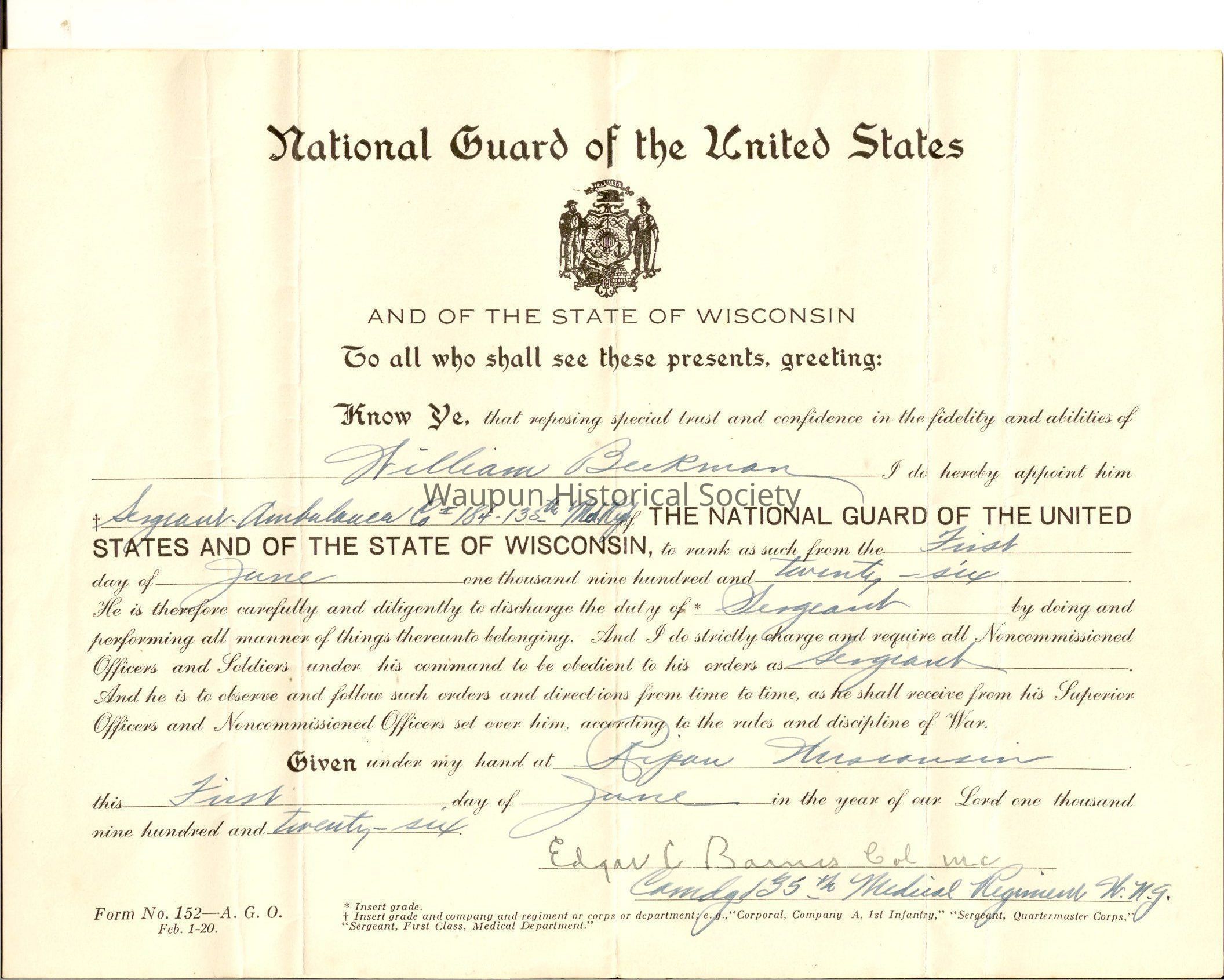 William Beekman appointed Sergeant, Ambulance Co. #184-135th Med.Regiment