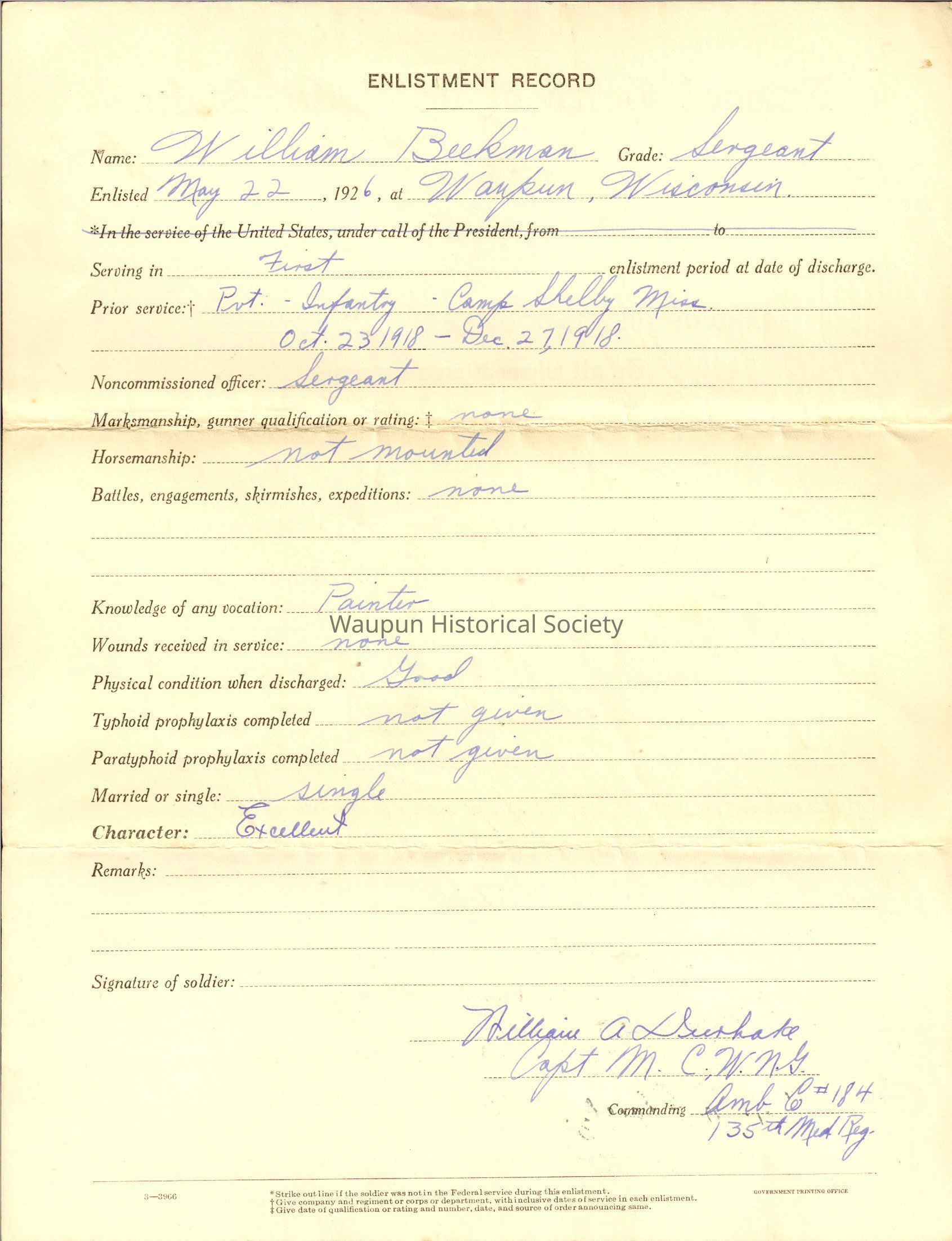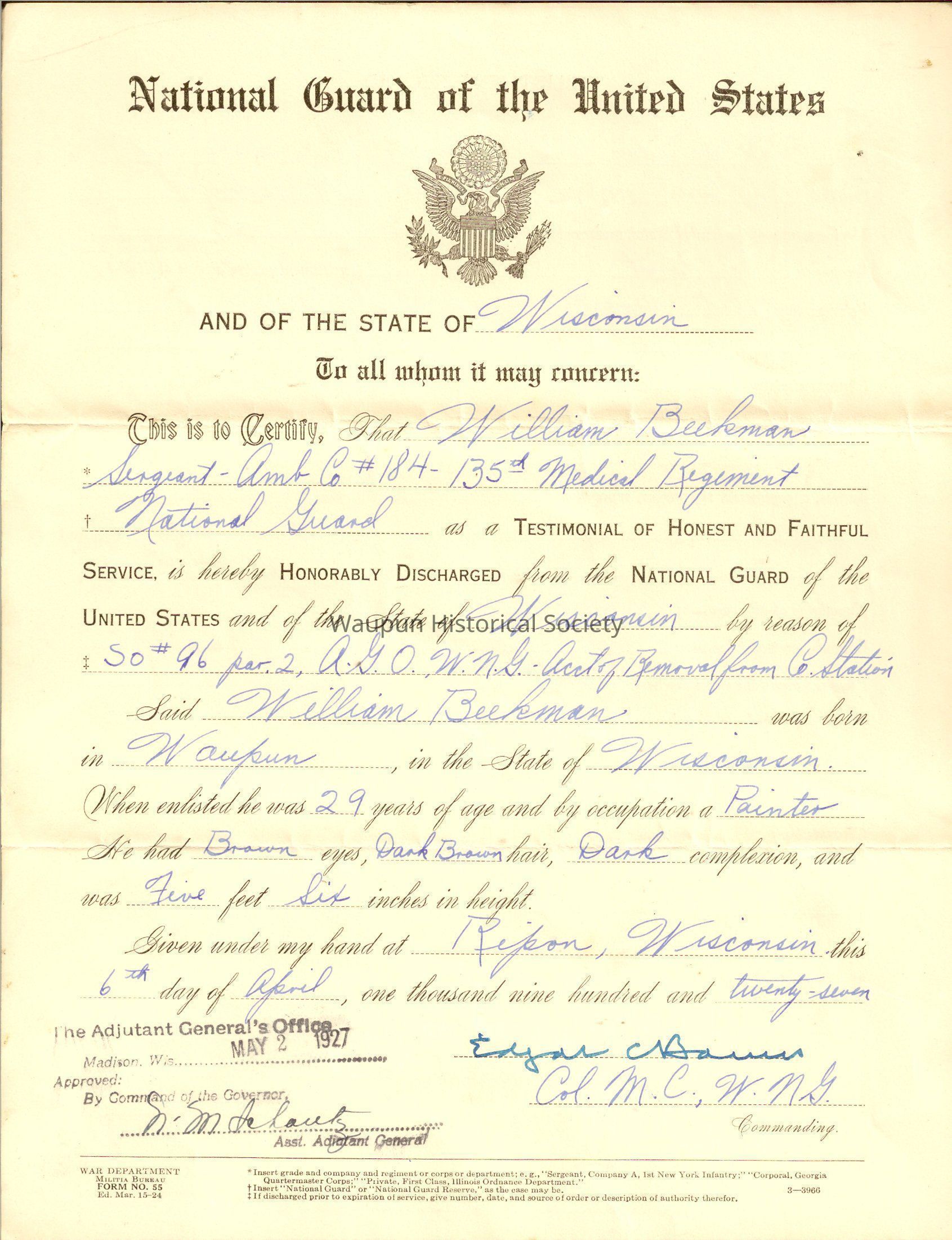 Honorable discharge for William Beekman April 6, 1927 in Ripon, Wisconsin. Signed by Commander Edgar C. Barnes*, Col. M.C., W.N.G.