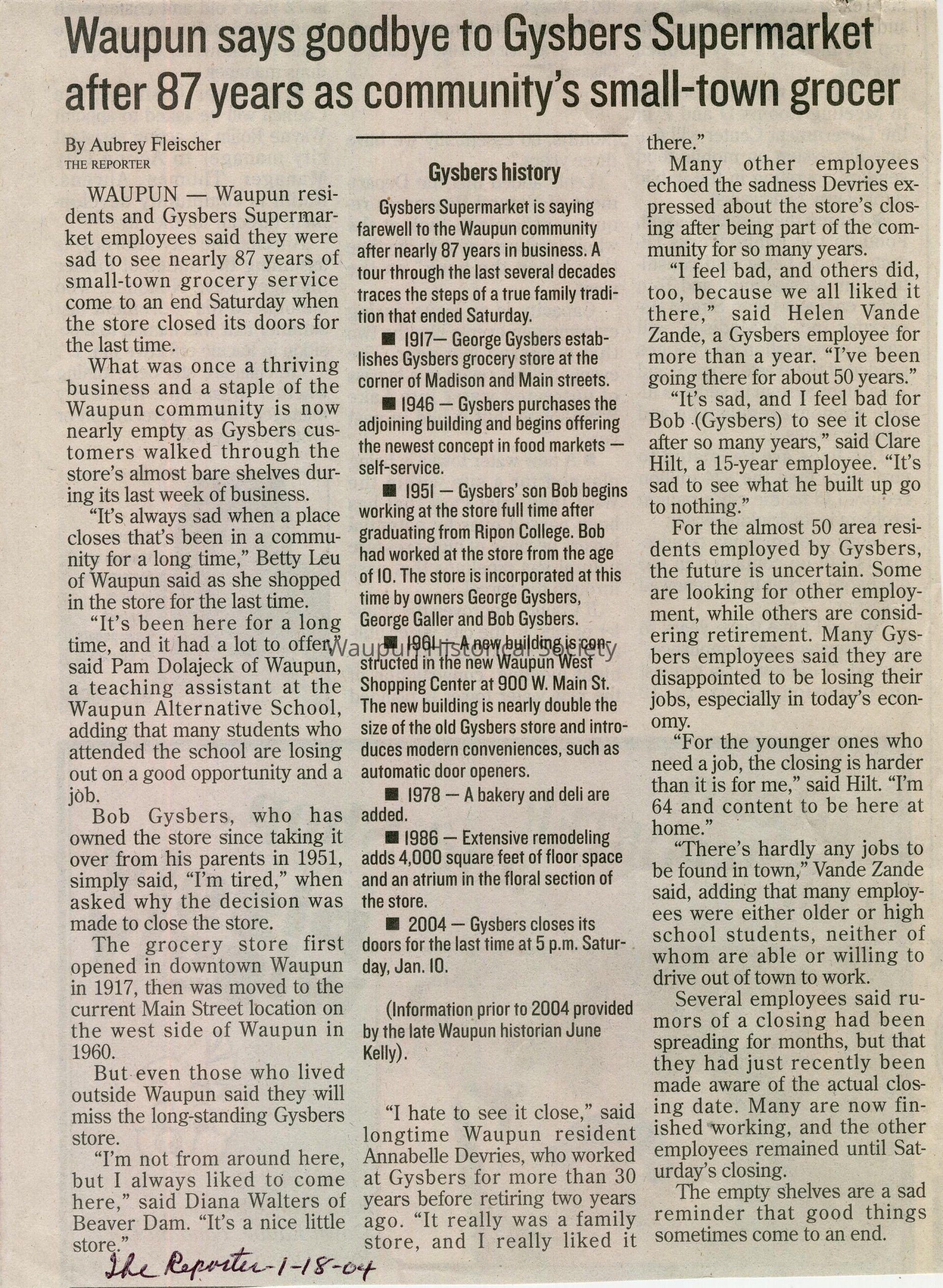 WAUPUN - Waupun residents and Gysbers Supermarket employees said they were sad to see nearly 87 years of small-town grocery service come to an end Saturday when the store closed its doors for the last time.