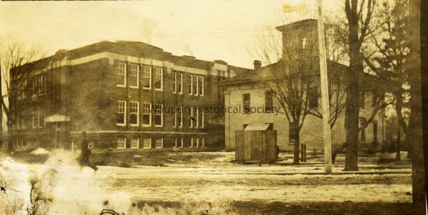 Appears to be a photocopy of a photo showing the original 1913 High School with the North Ward School in front. The North Ward School was razed when the New High School opened in 1913.Acquisition