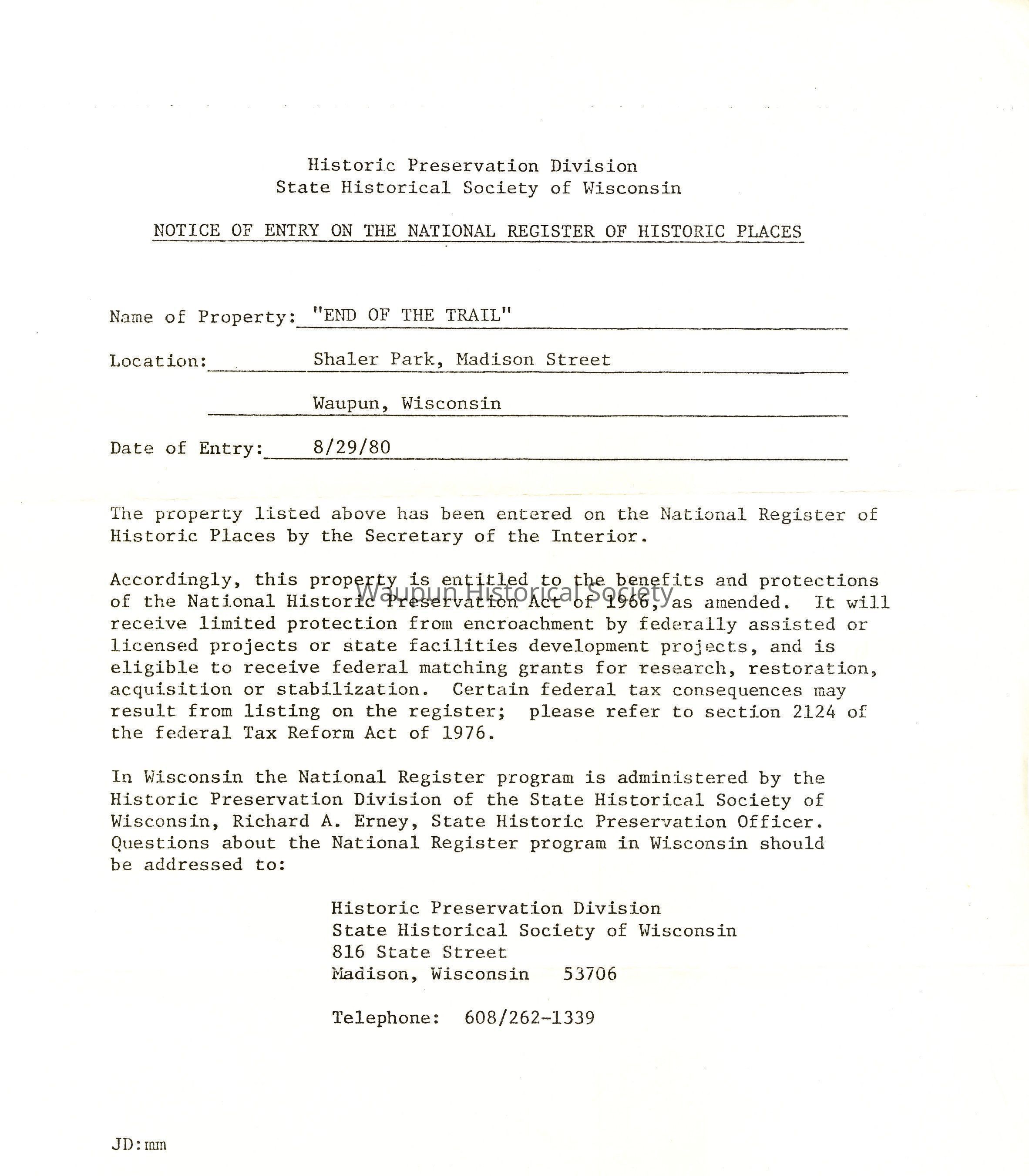 Notice of Entry on the National Register of Historic Places, for the statue of End of the Trail located at Shaler Park, Madison Street, Waupun, Wisconsin. Date of entry: 8/29/80.
