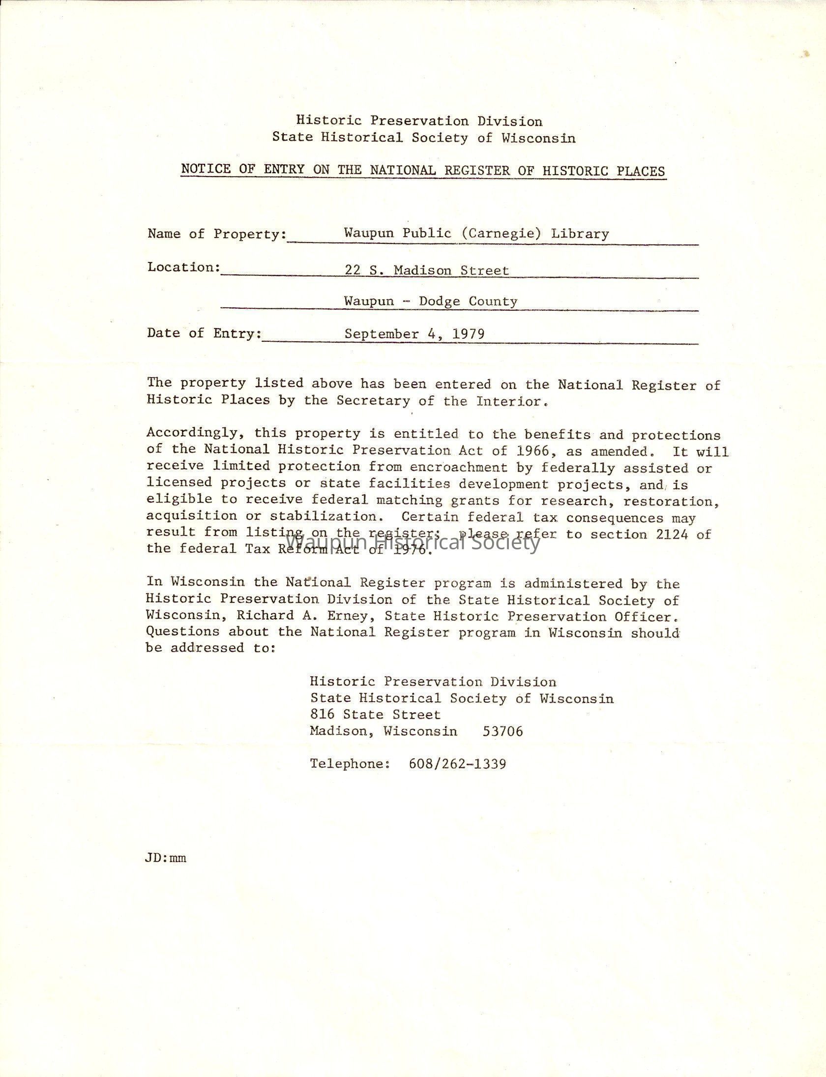 Waupun Historical Society, Notice of Entry on the National Register of Historic Places, CarnegieEntry/Object ID