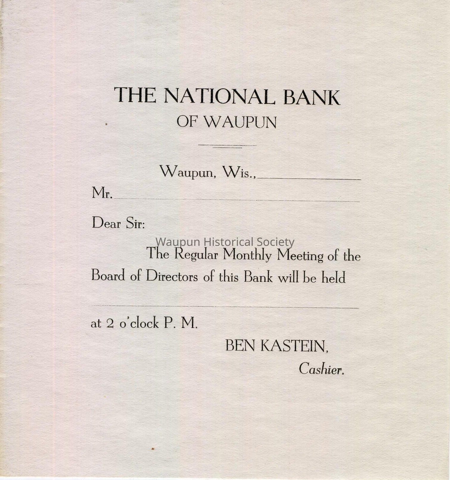 The National Bank of Waupun, Waupun, Wis., The Regular Monthly Meeting of the Board of Directors of this Bank will be held _________ at 2 o'clock P.M. Ben Kastein, Cashier.