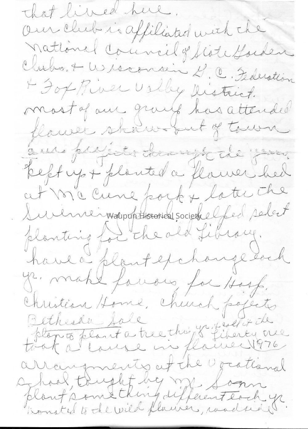 Historical information on Oak Openings Garden Club for 1976 Bicentennial Celebration in Waupun, WI.