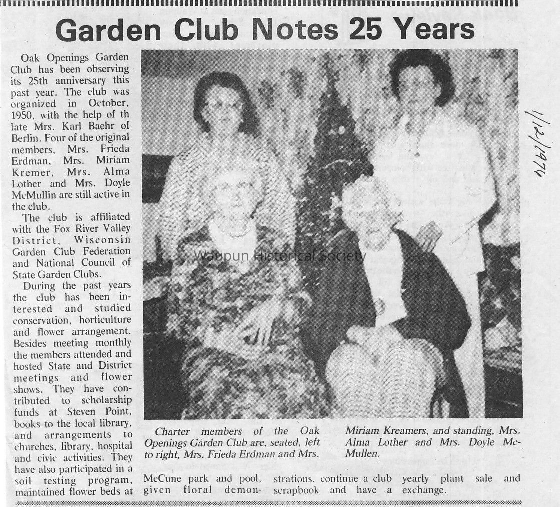Oak Openings Garden Club has been observing its 25th anniversary this past year. The club was organized in October, 1950, with the help of th late Mrs. Karl Baehr of Berlin. Four of the original members, Mrs. Frieda Erdman, Mrs. Miriam Kremer, Mrs. Alma Lother and Mrs. Doyle McMullin are still active in the club.