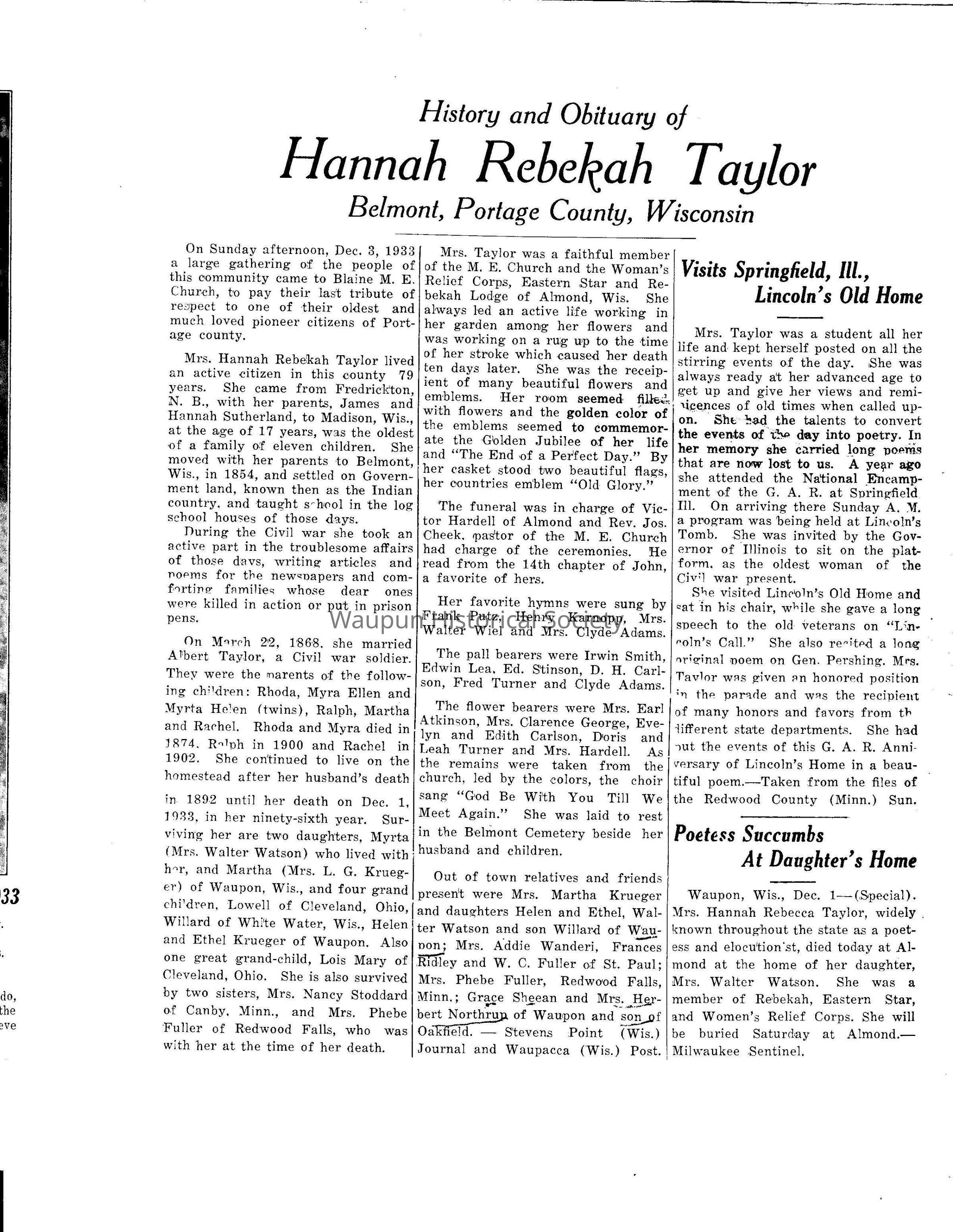 Waupun, Wis., Dec. 1-(Special). Mrs. Hannah Rebecca Taylor, widely known throughout the state as a poetess and elocutionist, died today at Almond at the home of her daughter, Mrs. Walter Watson. She was a member of Rebekah, Eastern Star, and Women's Relief Corps. She will be buried Saturday at Almond. --Milwaukee Sentinel.
