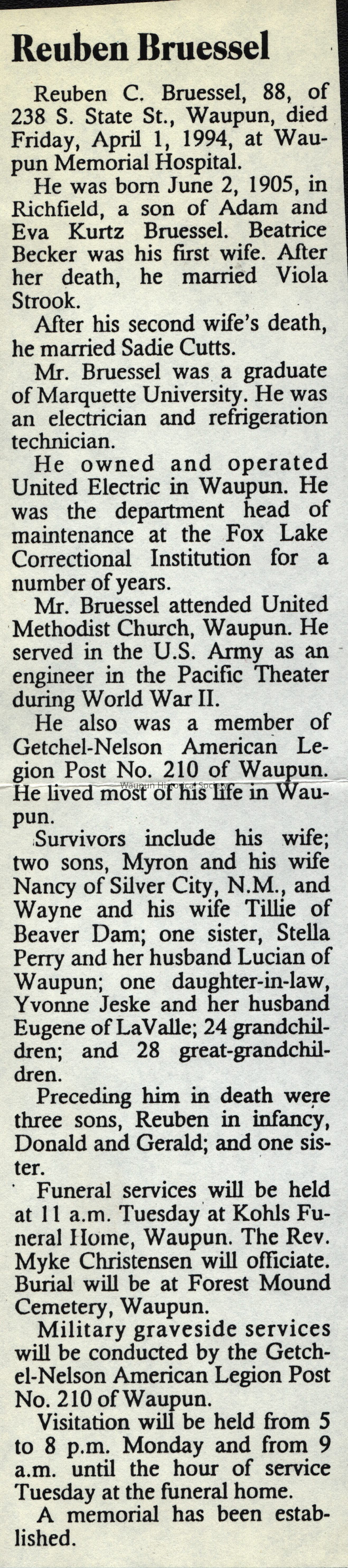 Obituary, Rueben Bruessel
